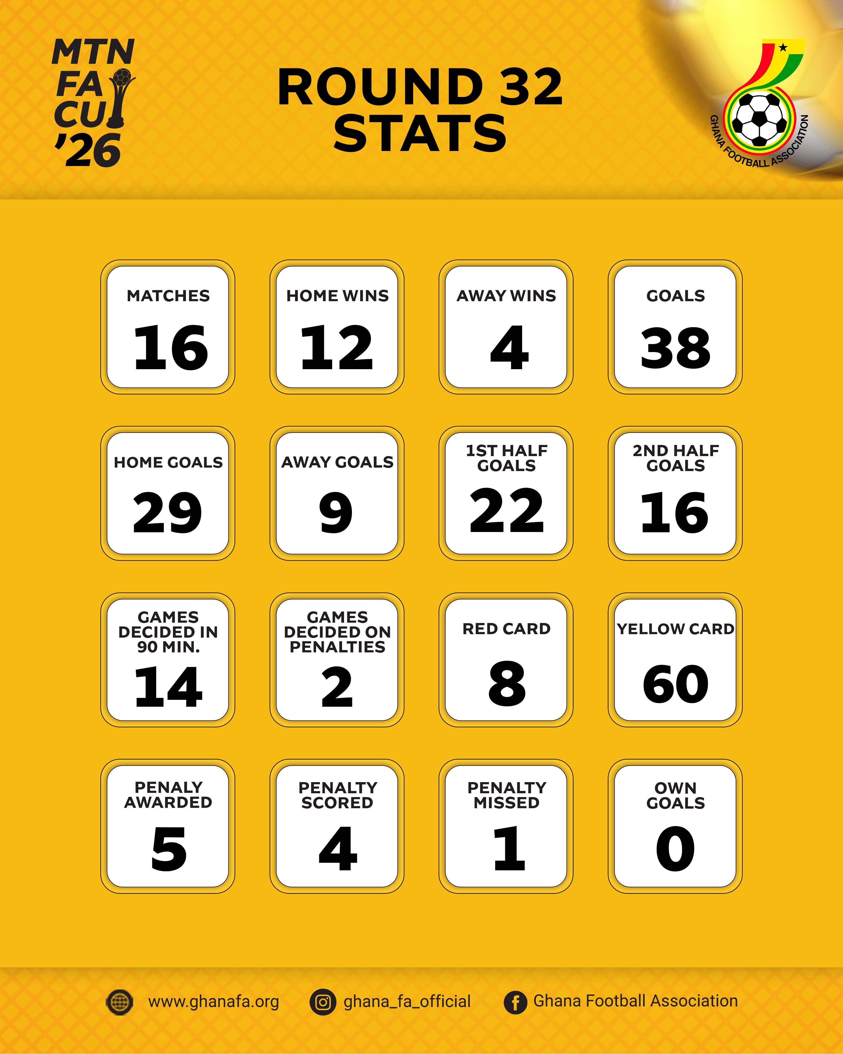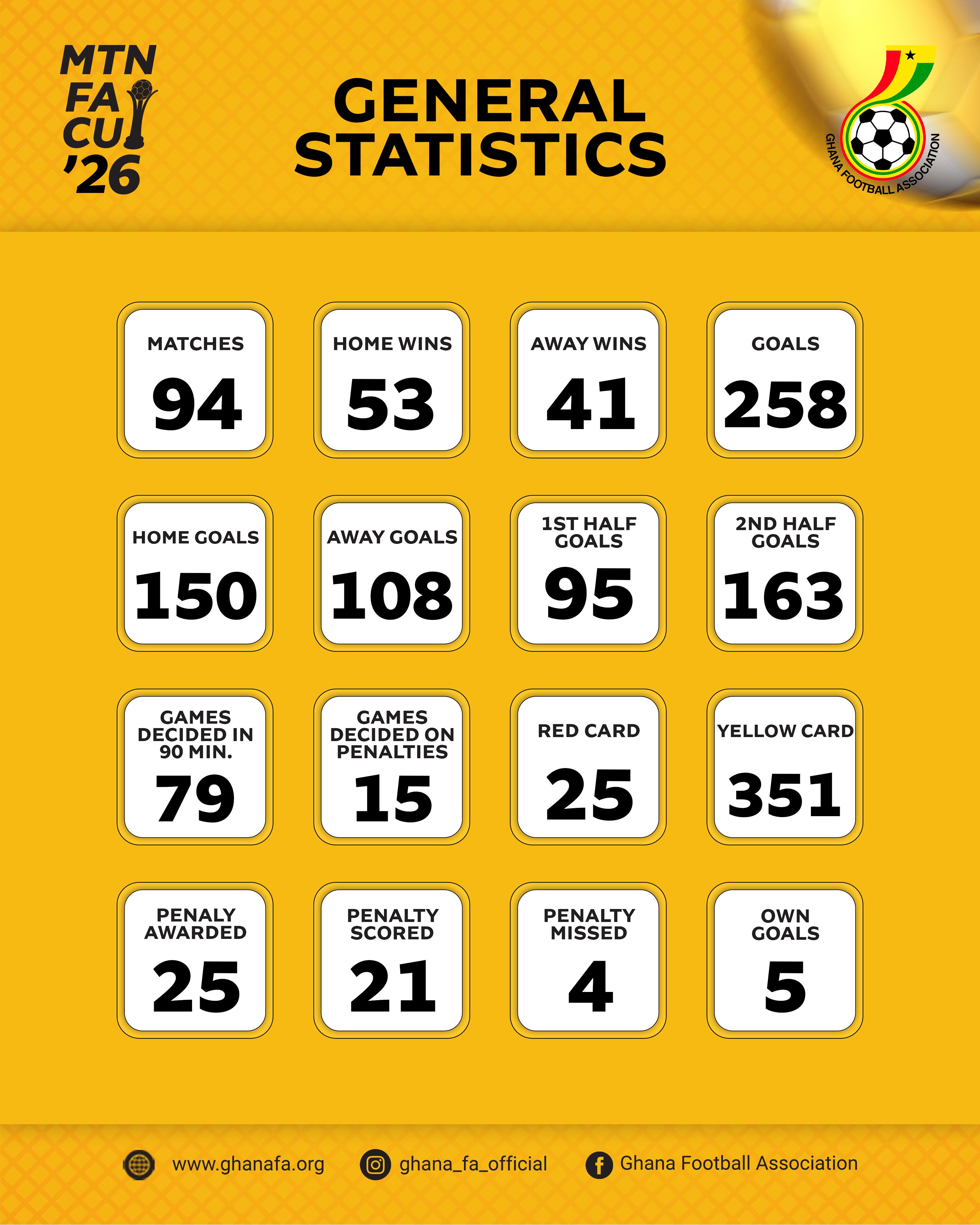 The MTN FA Cup has recorded a total of 94 matches following the preliminary round, Round of 64, and Round of 32 fixtures, with an impressive 258 goals scored so far—150 by home teams and 108 by away sides. Out of the 94 games played, 79 matches were decided within regulation time, while 15 fixtures were settled via penalty shootouts, highlighting the competitiveness of the tournament.