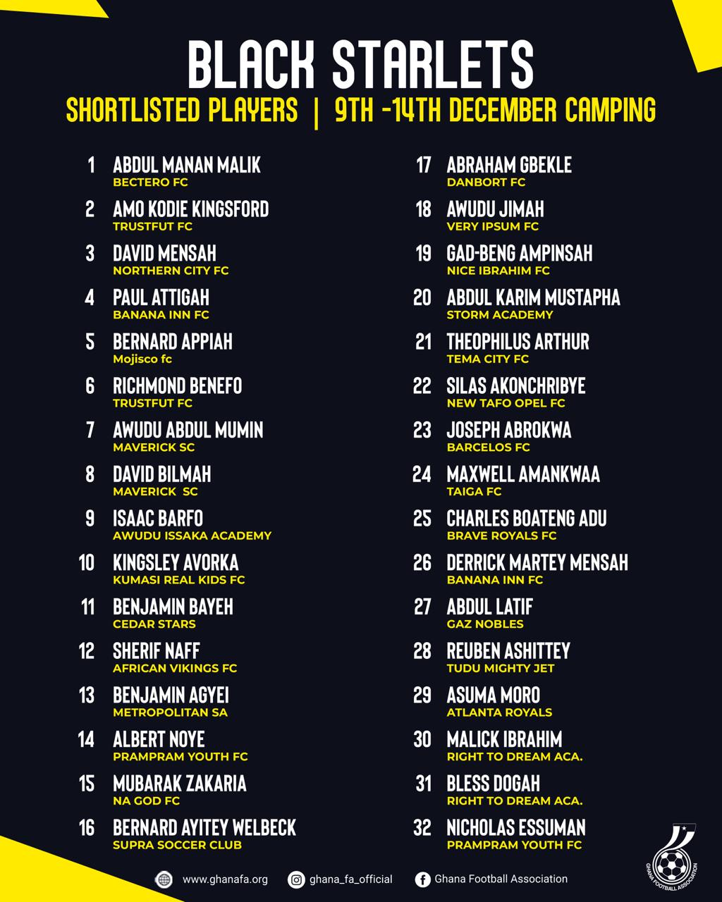 Below is the list of the 32 players selected for the final assessment:
