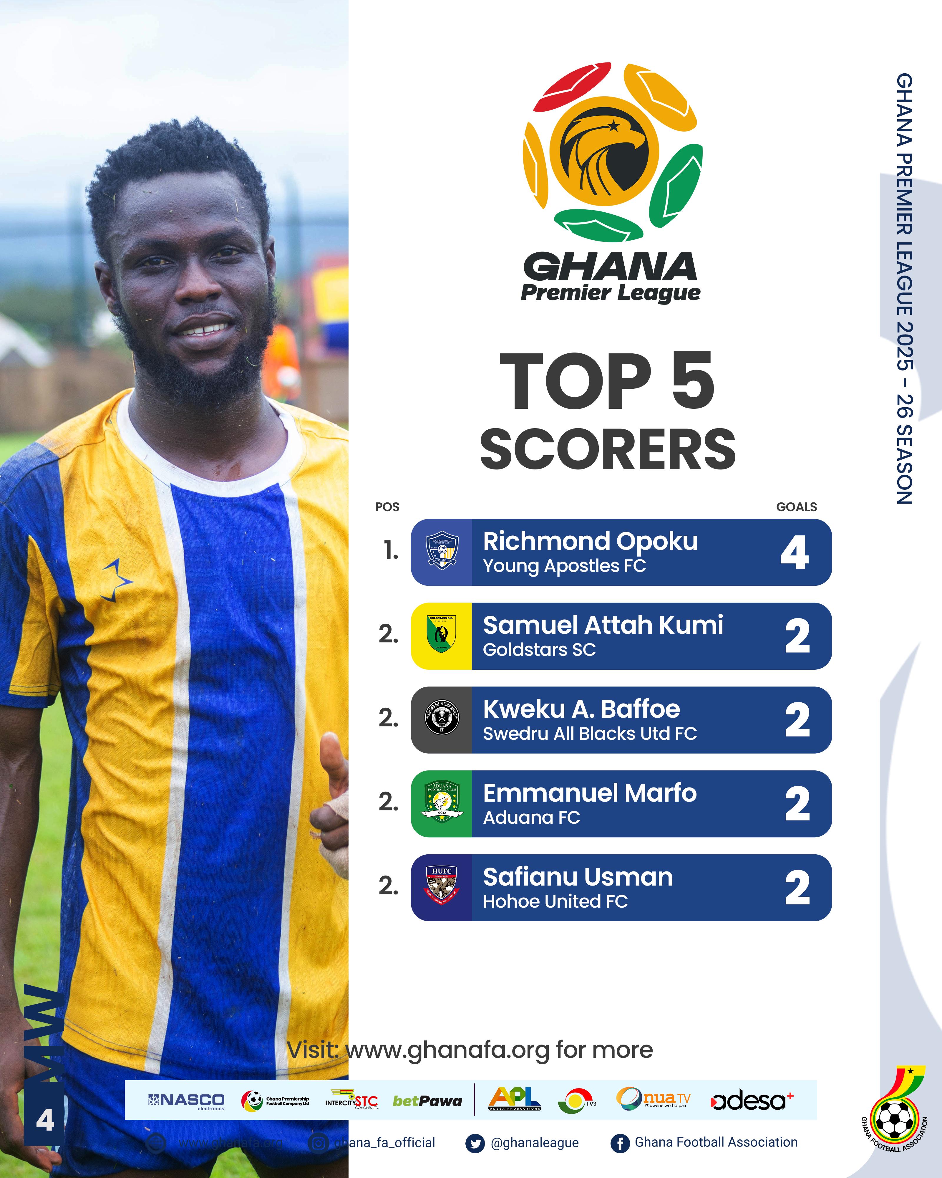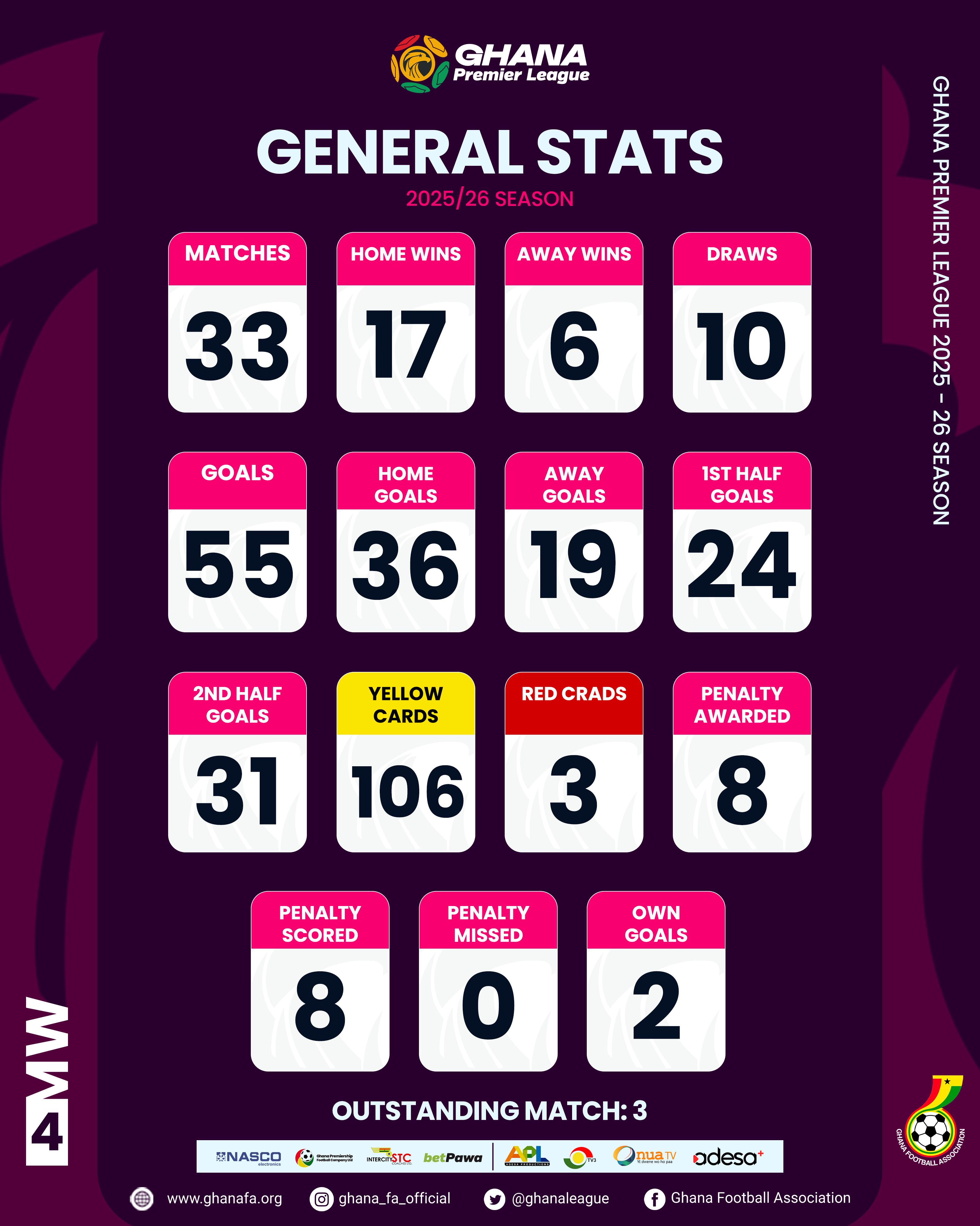 With three outstanding games yet to be played, the Ghana Premier League has so far recorded 33 matches, producing 17 home wins, 6 away wins, and 10 draws. A total of 55 goals have been scored—36 by home teams and 19 by away sides. Of these, 24 goals came in the first half, while 31 were scored in the second half.