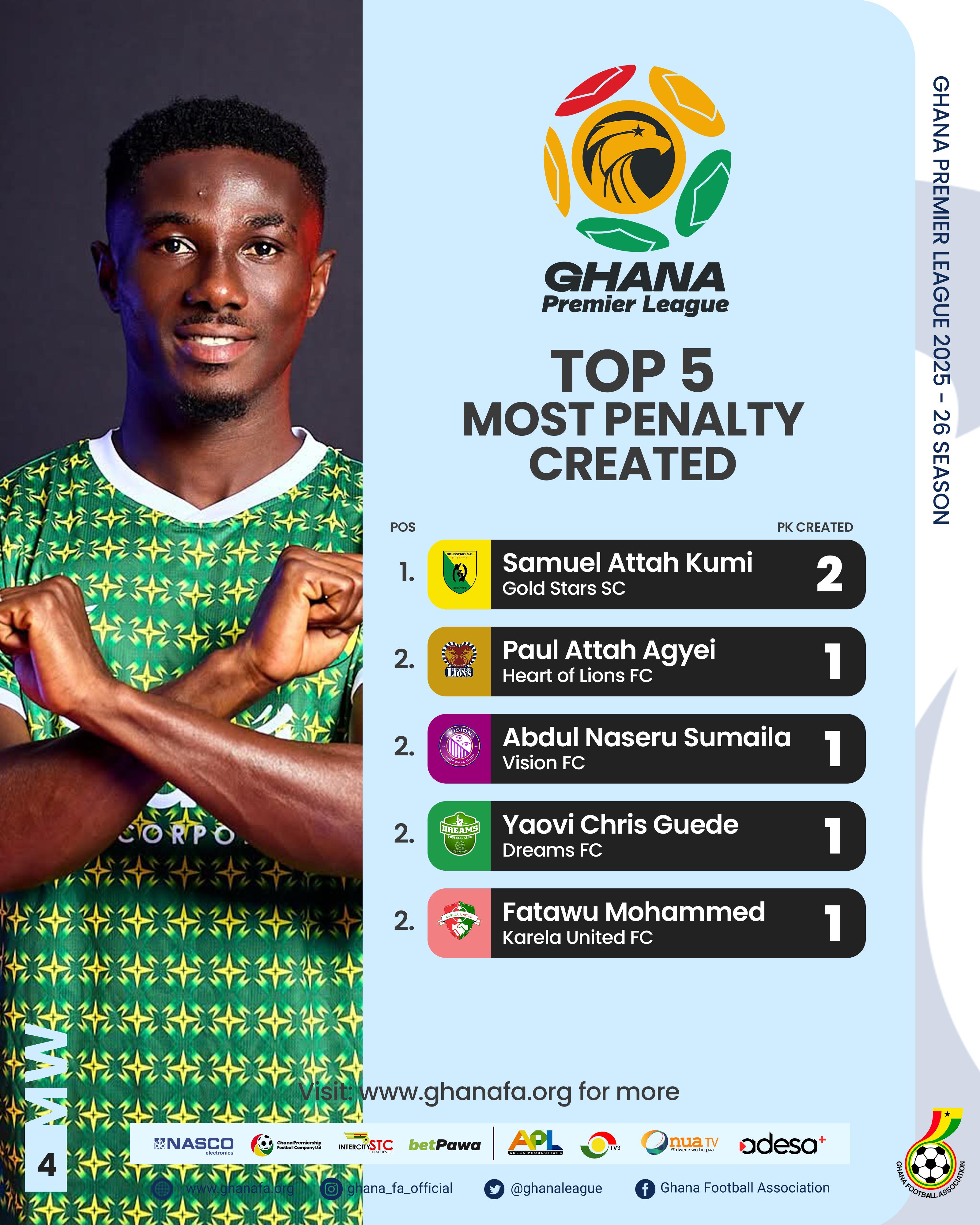 There have been 8 penalties awarded, all successfully converted, with Samuel Attah Kumi of Gold Stars creating two of them—the most by any player.