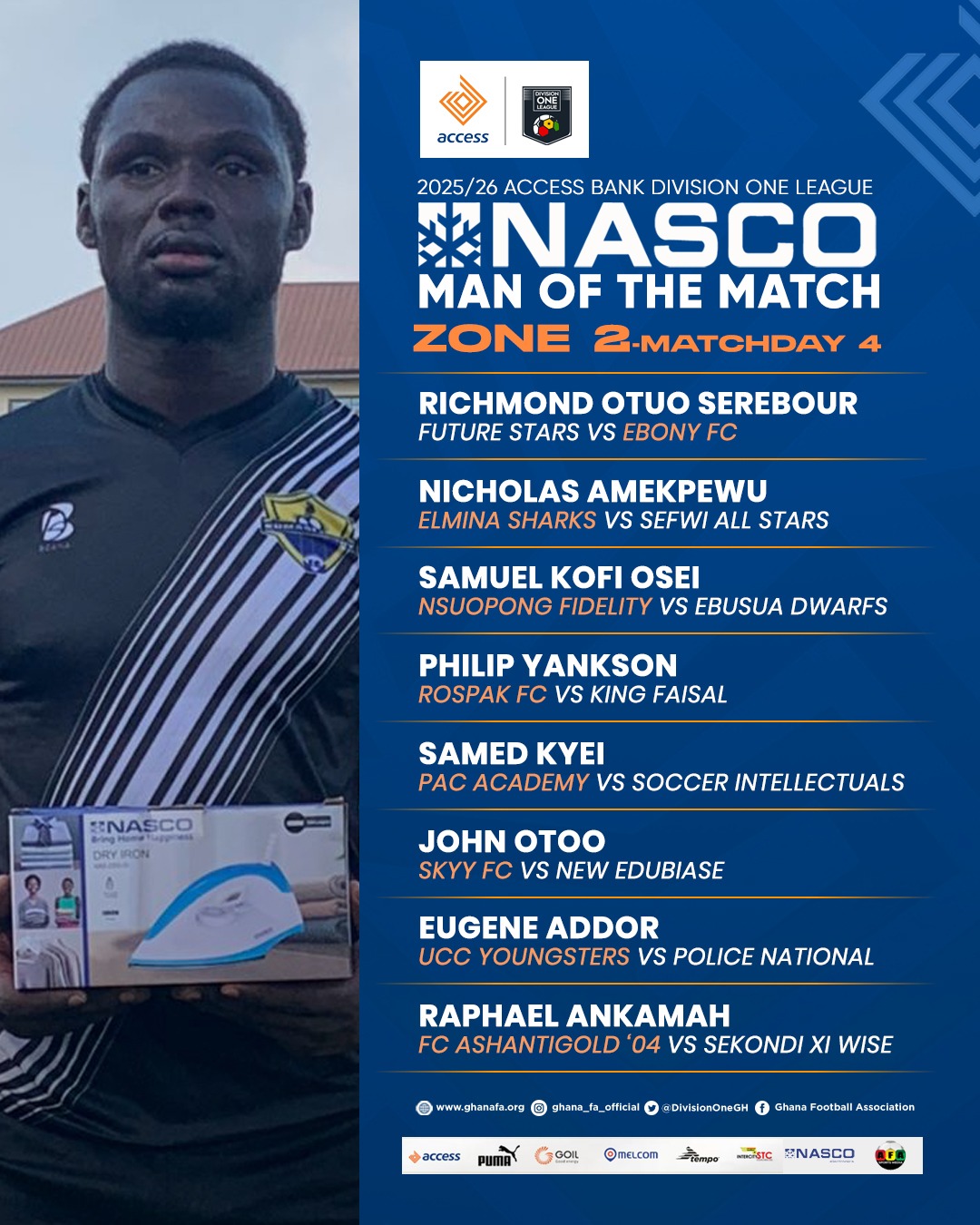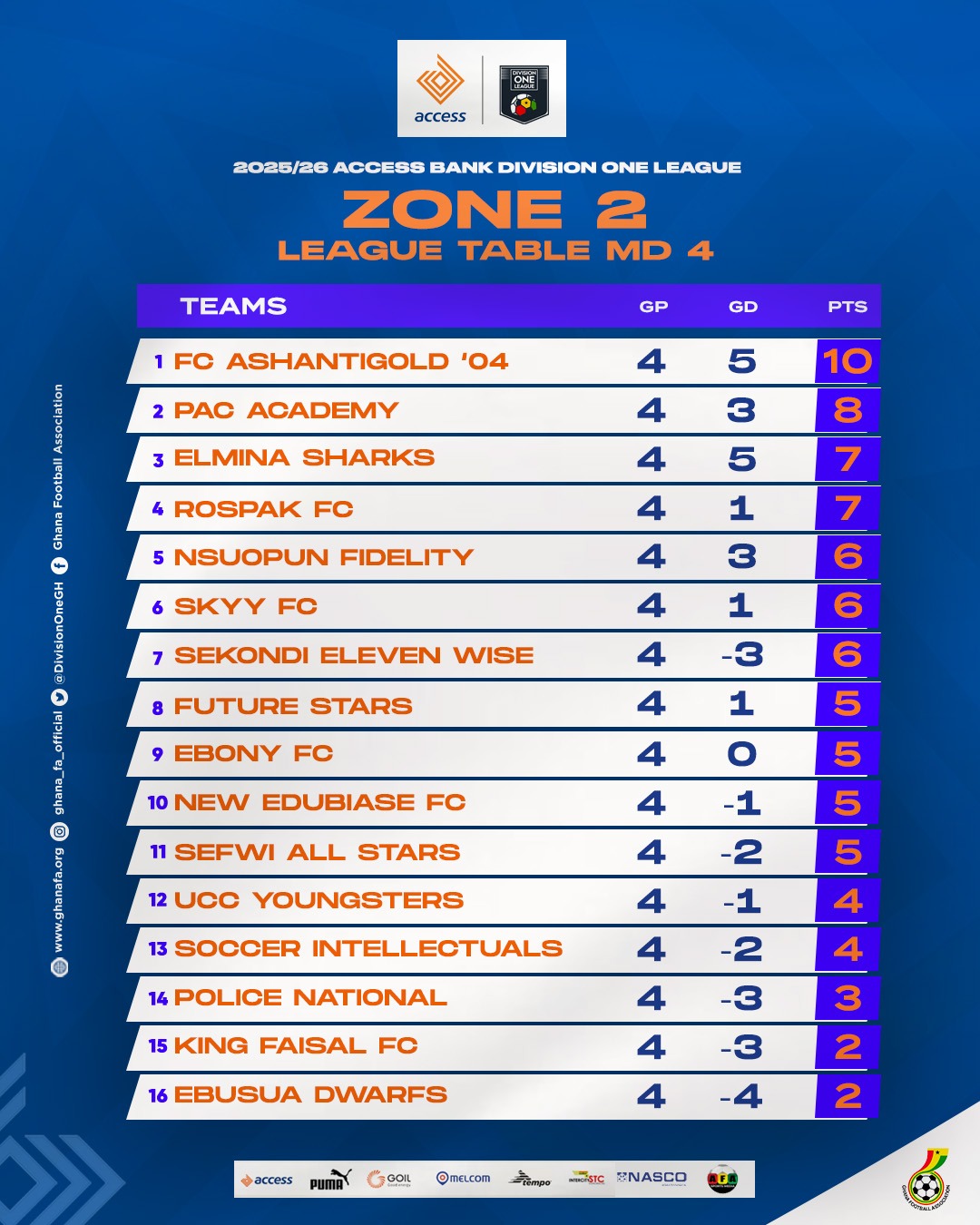 In Zone Two, FC AshantiGold continues to prove its strength and resilience. They are not only unbeaten after four games but also stand out as the only side yet to concede a goal in the entire league. Their defensive solidity and efficient attack have earned them 10 points, placing them at the top of the zone.