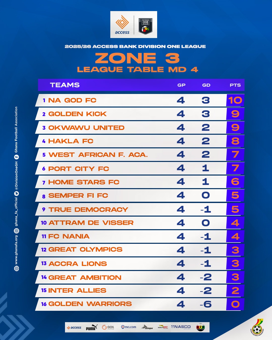 Finally, in Zone Three, Na God FC has taken control of the standings with 10 points, showing consistency and attacking flair. Golden Kick and Okwawu United are both just a step behind on 9 points each, maintaining pressure on the league leaders. However, it has been a tough introduction to life in the Division One League for newly promoted Golden Warriors, who are yet to secure a single point, sitting 16th after losing all four of their matches.