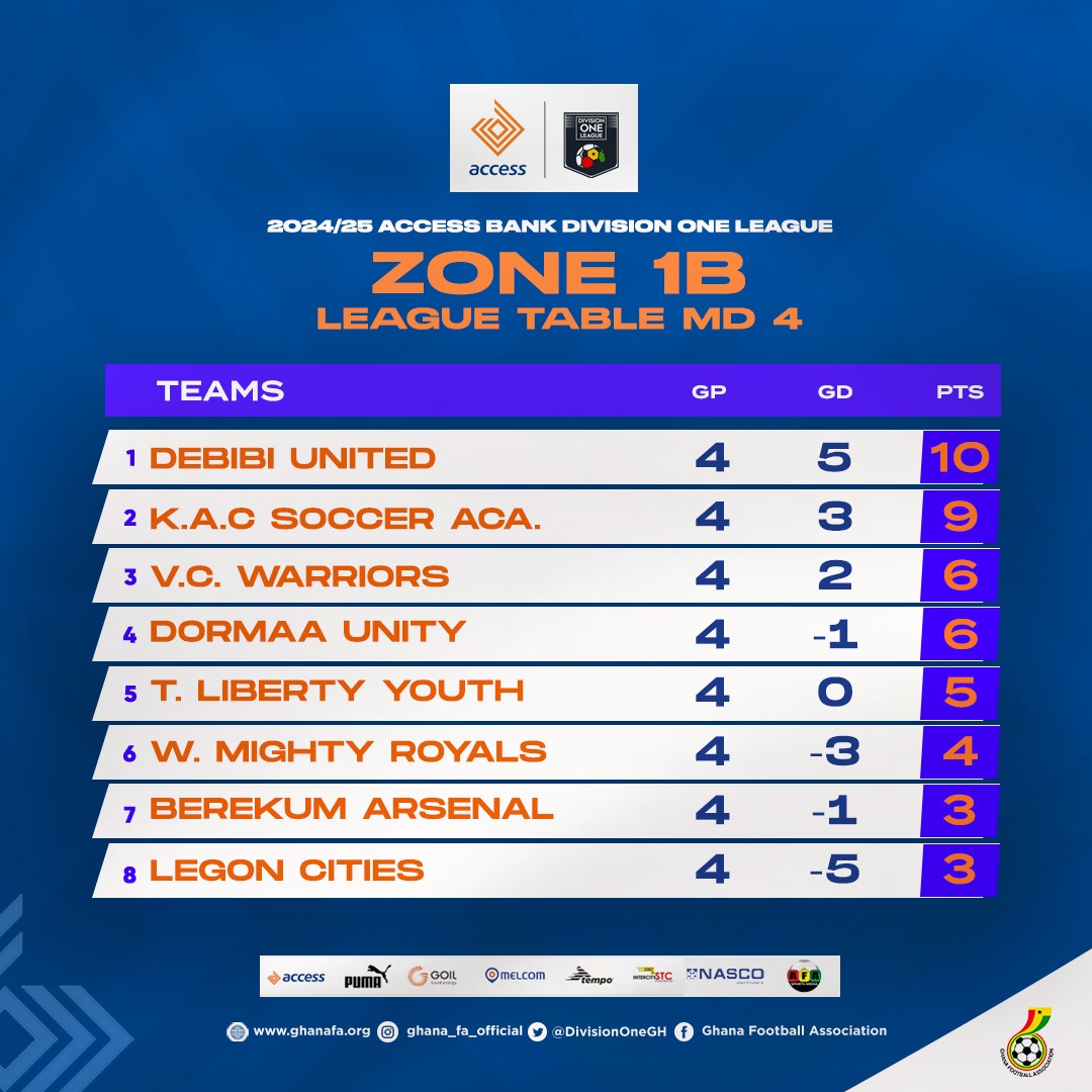 Over in Zone One B, Debibi United leads the standings with 10 points, demonstrating impressive form in the early stages of the season. They are closely pursued by KAC Soccer Academy, who have also shown strong performances, accumulating 9 points. Meanwhile, Legon Cities have struggled to find their rhythm, sitting in 8th place with just 3 points, having lost three of their opening four matches.