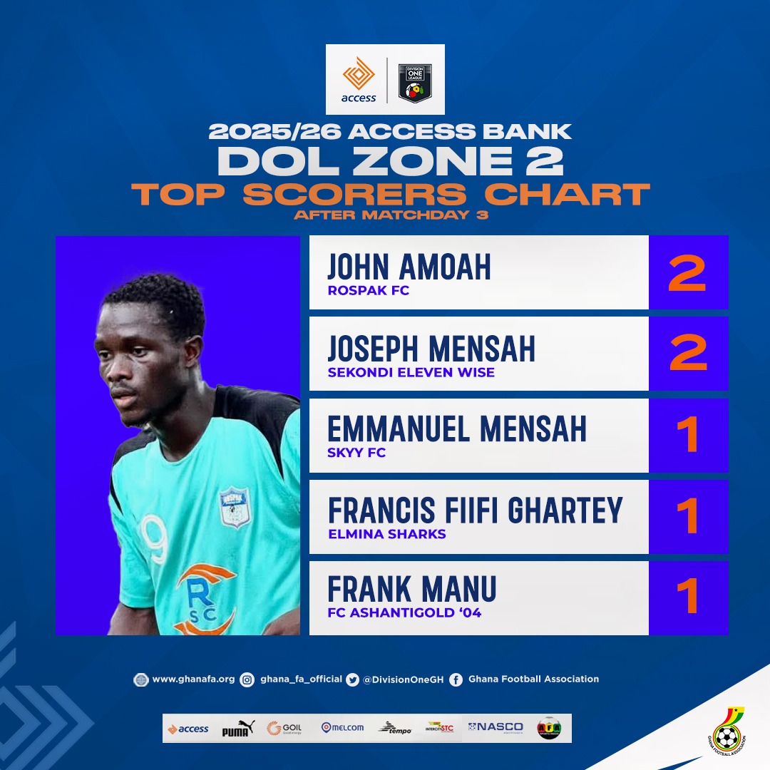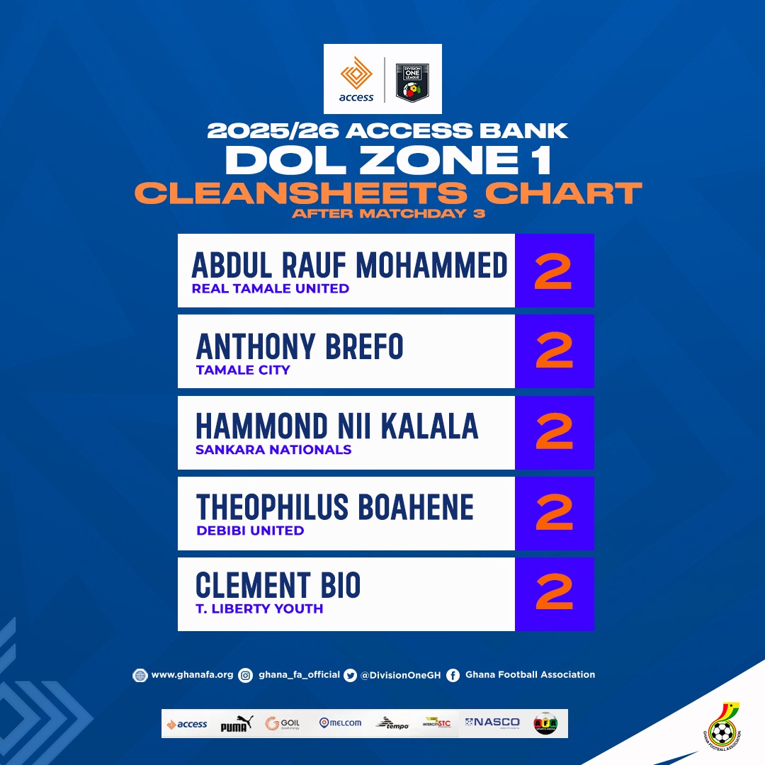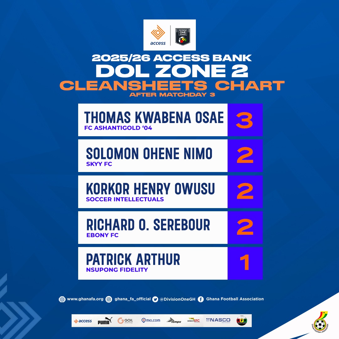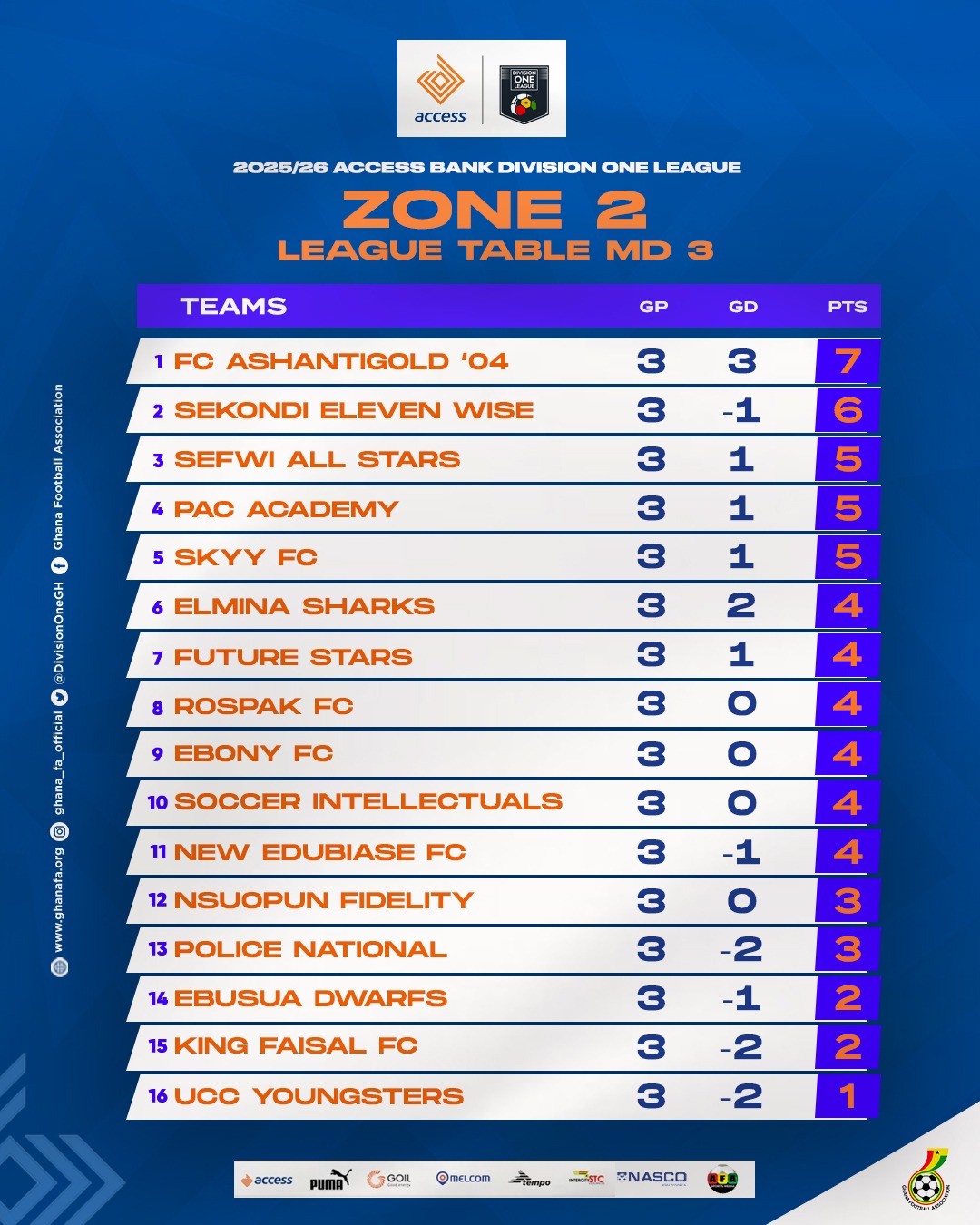 In Zone Two, FC AshantiGold 04 sits at the top with 7 points, having recorded two wins and one draw. Remarkably, they remain the only side yet to concede a goal after Matchday 3.
