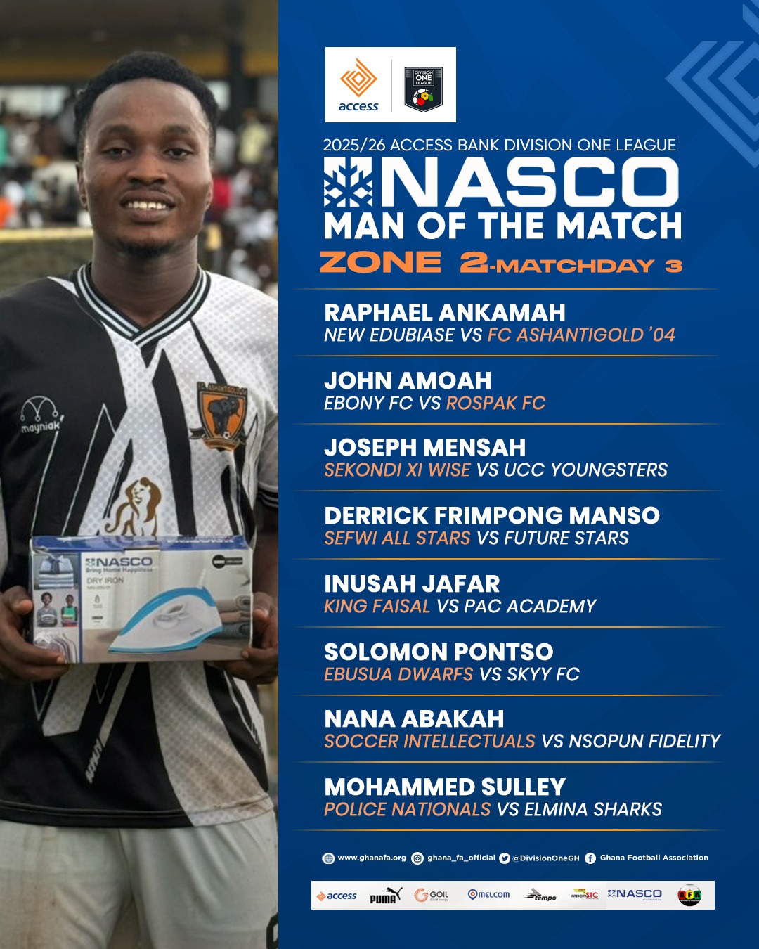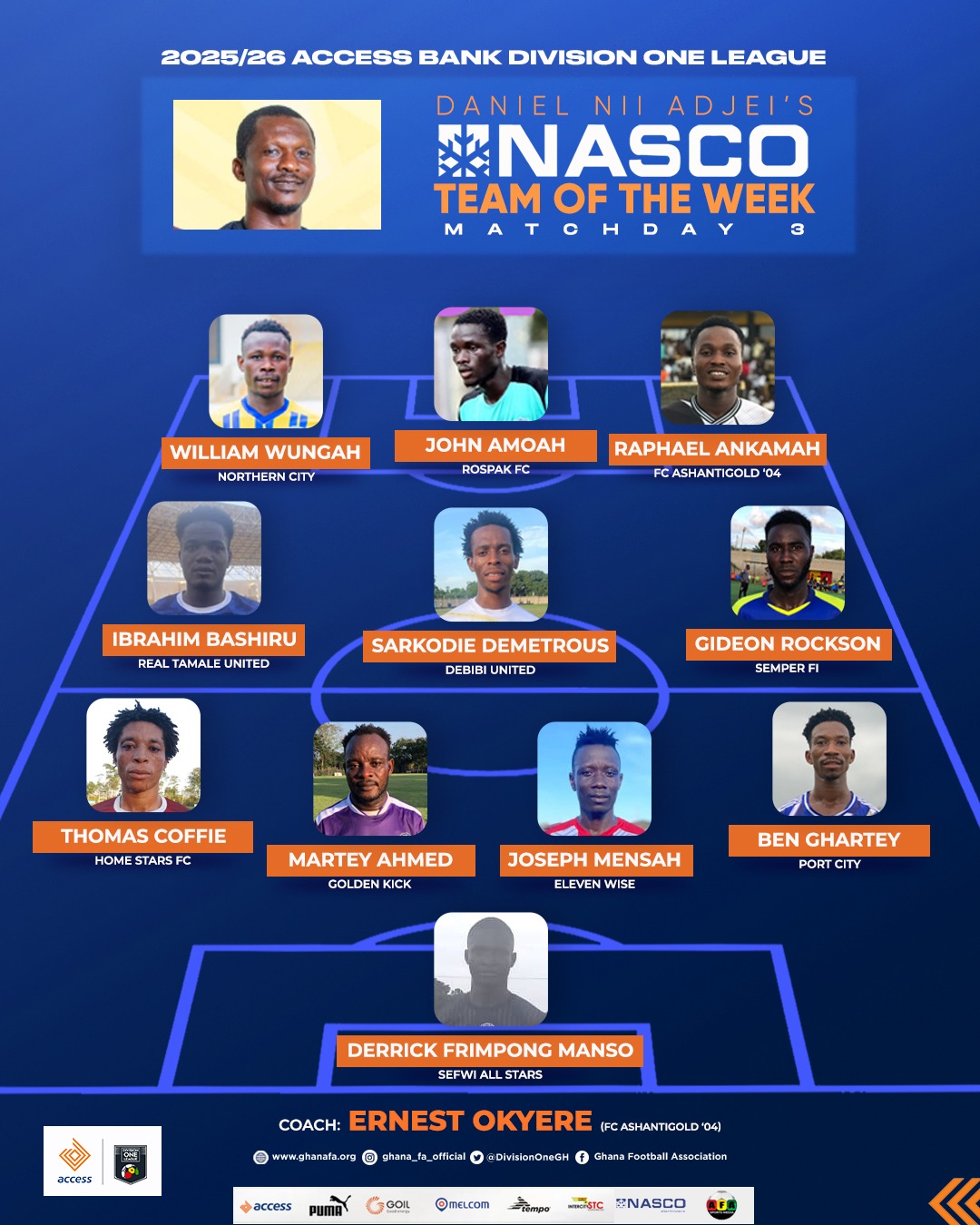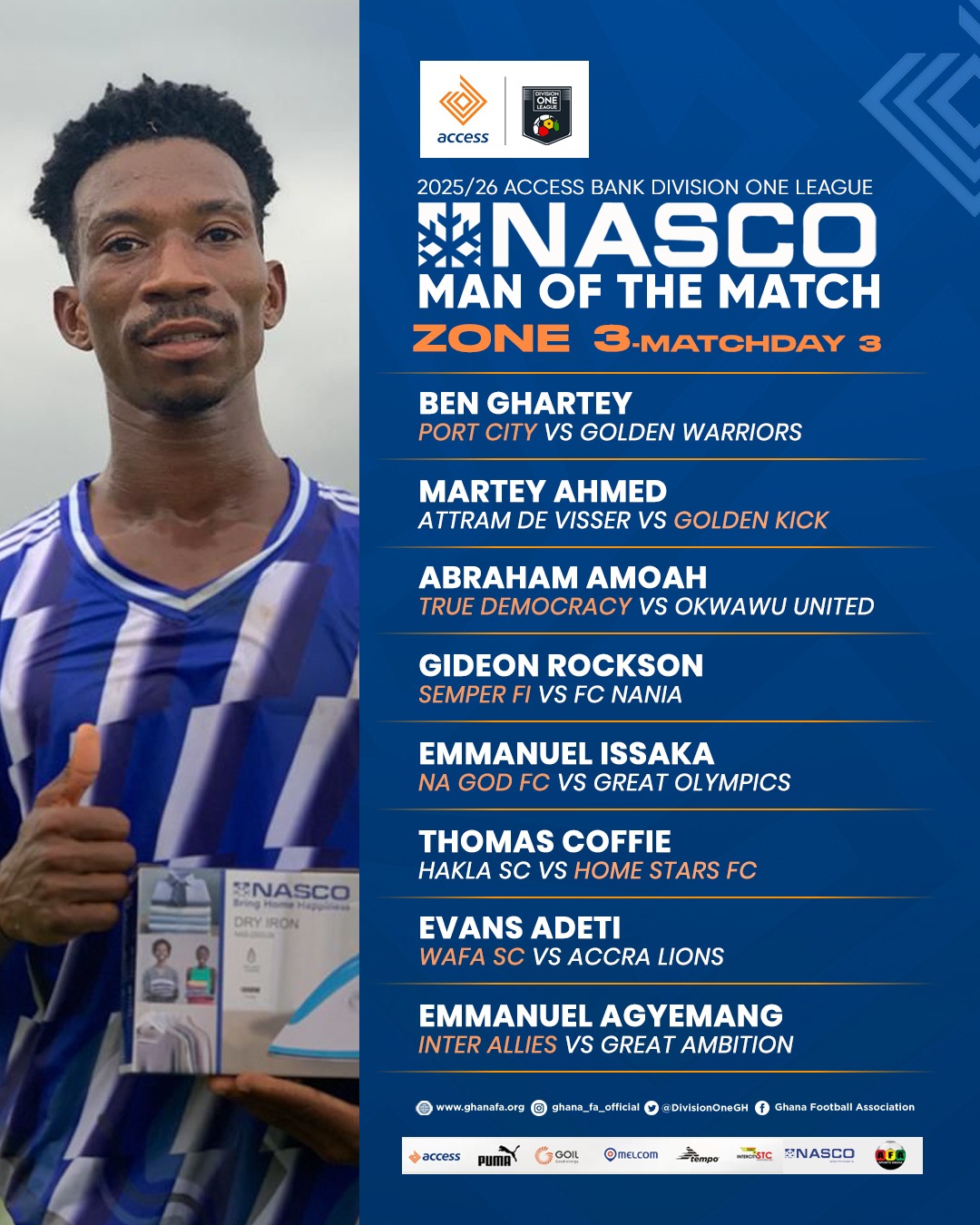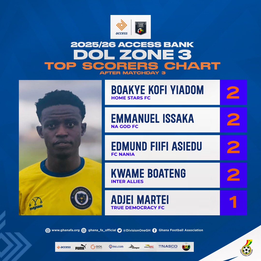 FC AshantiGold 04, Na God FC, Sankara Nationals, and Debibi United continue to impress as they top their respective zones after an exciting start to the season. Na God FC currently leads the overall standings with 9 points, winning all three of their league games so far. Golden Kick, Port City, and Okwawu United follow closely with 6 points each after Matchday 3.