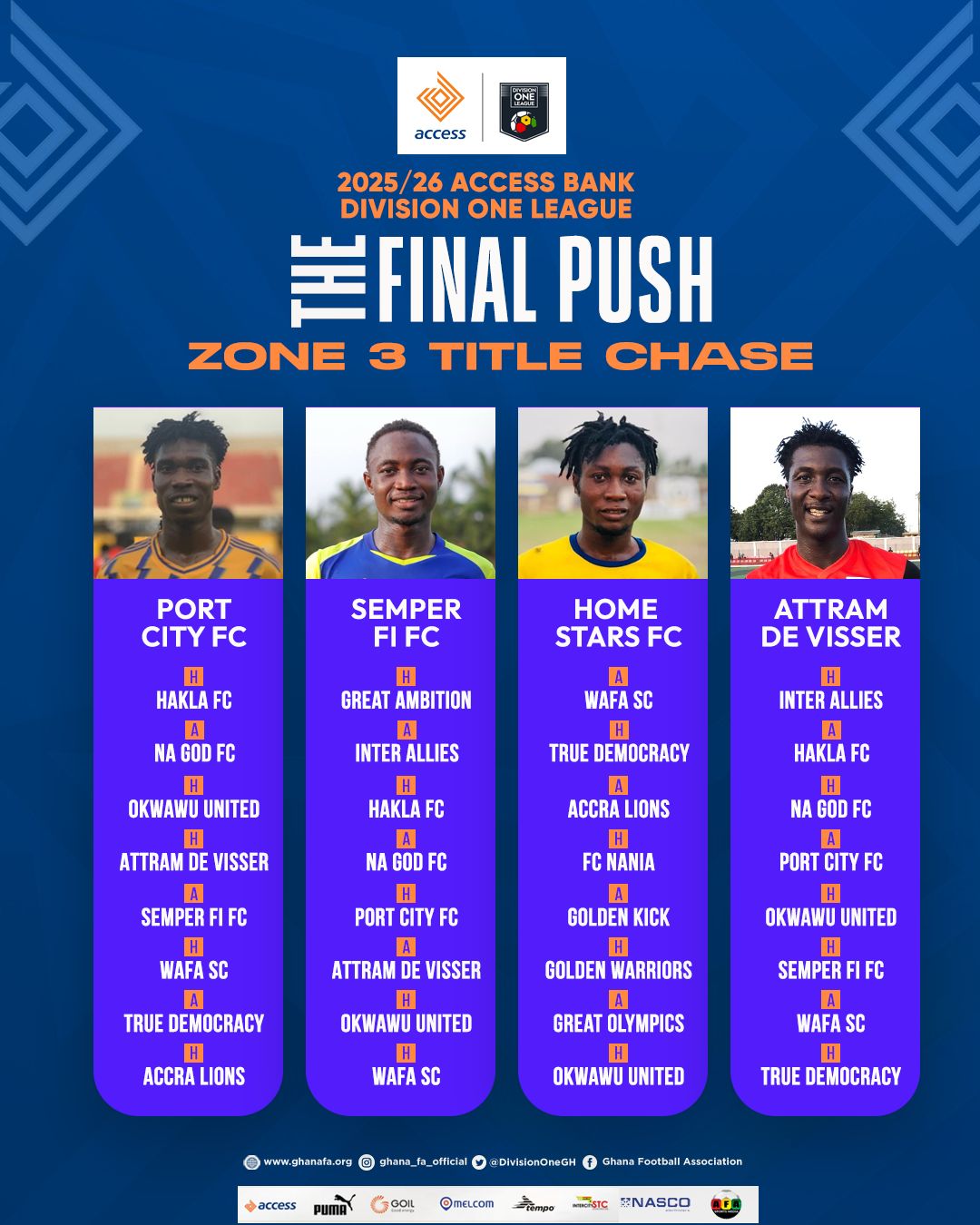 In Zone Three, four teams are locked in a fierce contest for the top spot. Port City FC and Semper Fi FC both hold a slight edge with five home matches and three away fixtures remaining, potentially giving them an advantage on familiar ground. Attram De Visser share a similar path with five home and three away games, while Home Stars FC face a more balanced but demanding run with four home and four away matches to navigate.