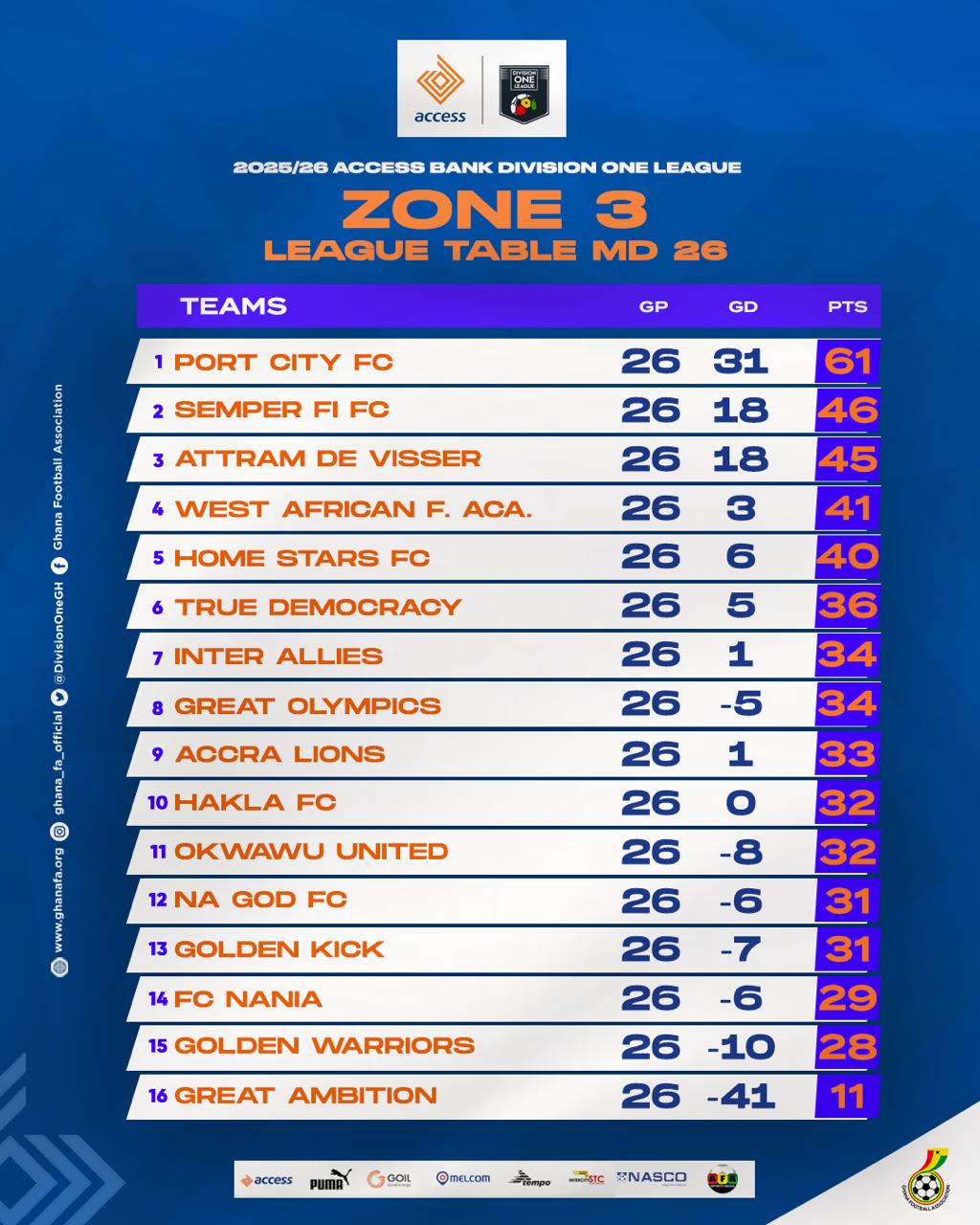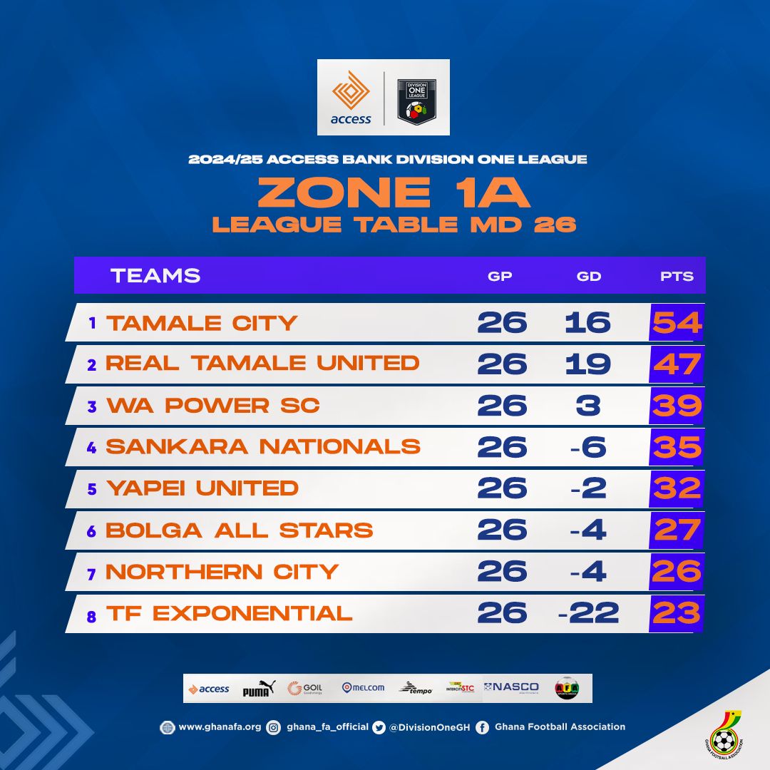 Port City FC, in Zone Three, have already sealed qualification to the Ghana Premier League. In Zone One A, Tamale City have secured their place in the playoff with two games to spare, while Debibi United, from Zone One B, booked their playoff spot.