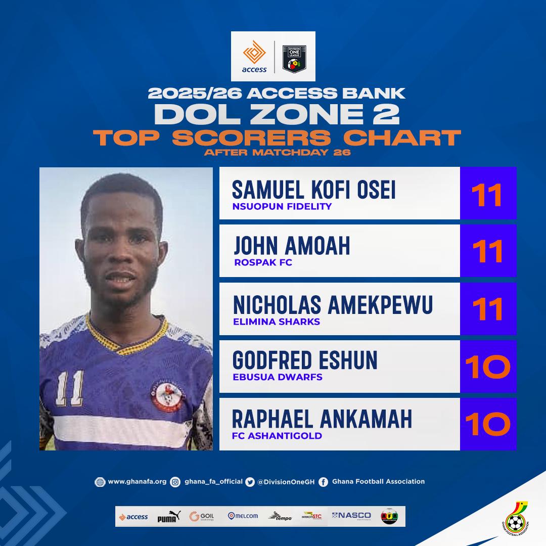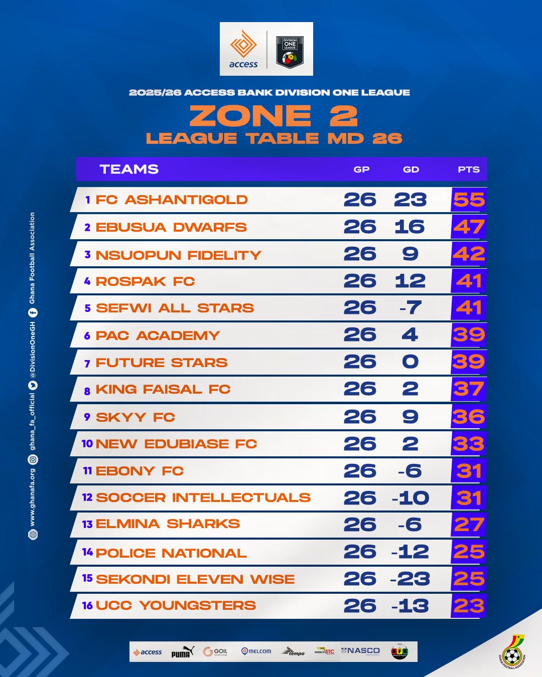 In Zone Two, AshantiGold SC currently lead the table with 55 points, with Ebusua Dwarfs in second place on 47 points.