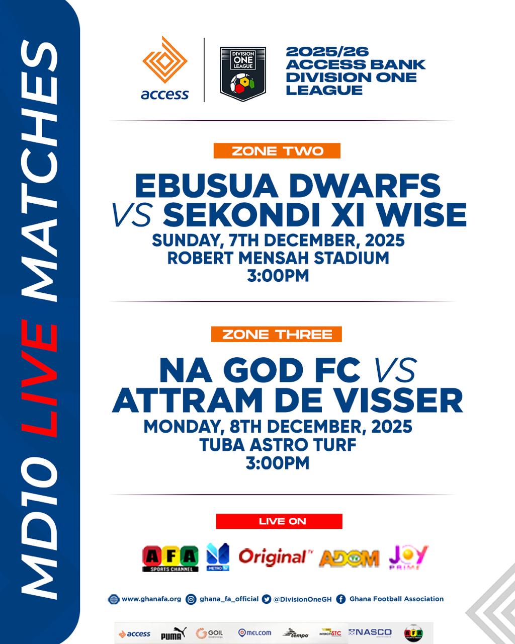 Two live matches are scheduled for Matchday 10 of the Access Bank Division One League, as confirmed by the Competitions Department. Broadcast partners AFA, Metro TV, Original TV, Adom TV, and Joy Prime will air the Cape Coat Mysterious Ebusua Dwarfs vs Sekondi Eleven Wise game on Sunday, December 7, and the game between Na God FC and Atrram De Visser on Monday, December 8, 2025 at the Tuba Astro Turf.