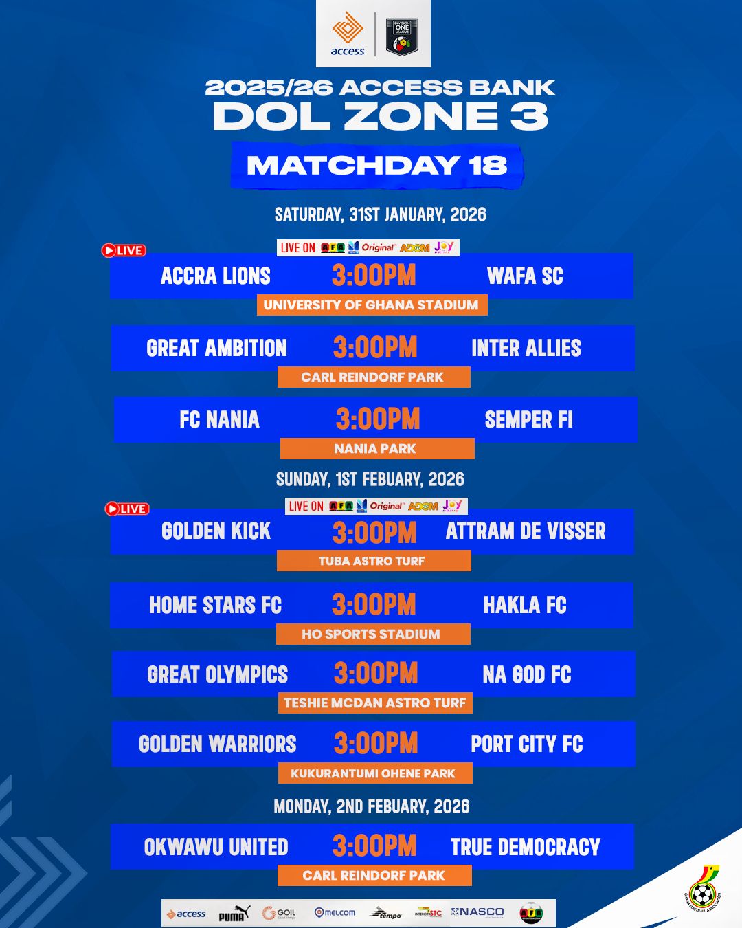 Other key fixtures include Okwahu United vs True Democracy, Accra Great Olympics hosting Na God FC, and Great Ambition taking on Inter Allies at Carl Reindorff Stadium in Dansoman.