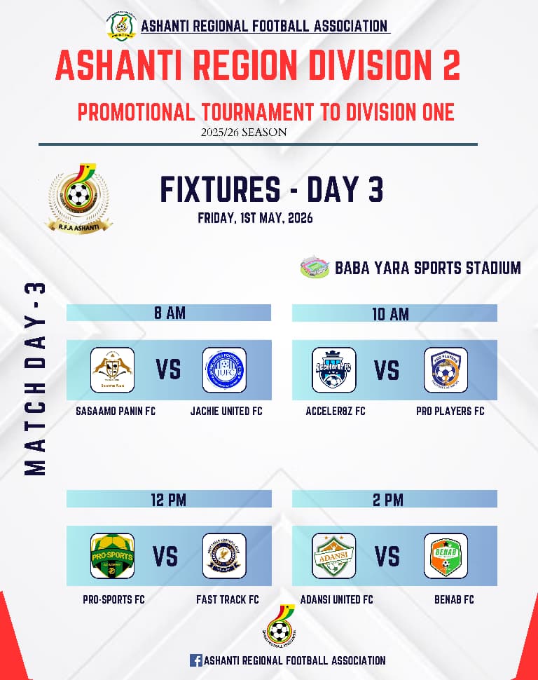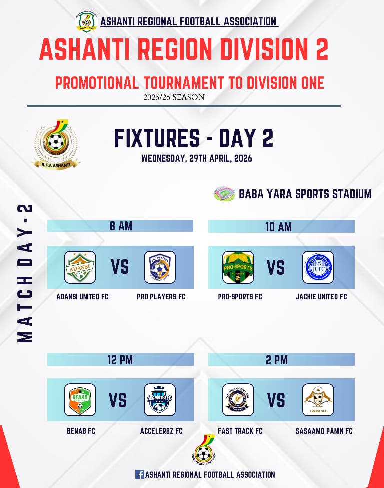 Below are fixtures for Match Day Two and Match Day Three as released by the Ashanti Regional Football Association and are expected to further intensify the competition as teams strive to secure qualification from the group stage.
