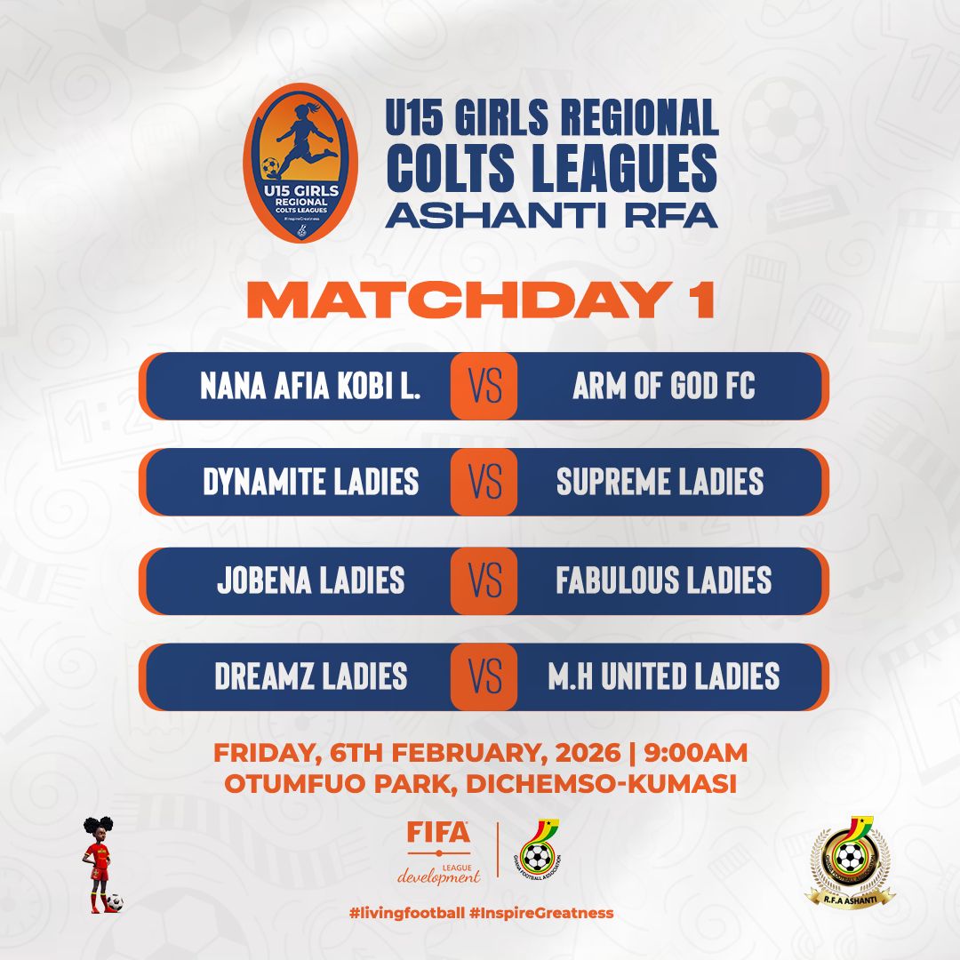 The Ashanti Regional Football Association (RFA), in partnership with FIFA’s League Development Programme, officially kicks off the 2026 U15 Girls Regional Colts League on Friday, February 6, at the Otumfuo Park in Dichemso, Kumasi.