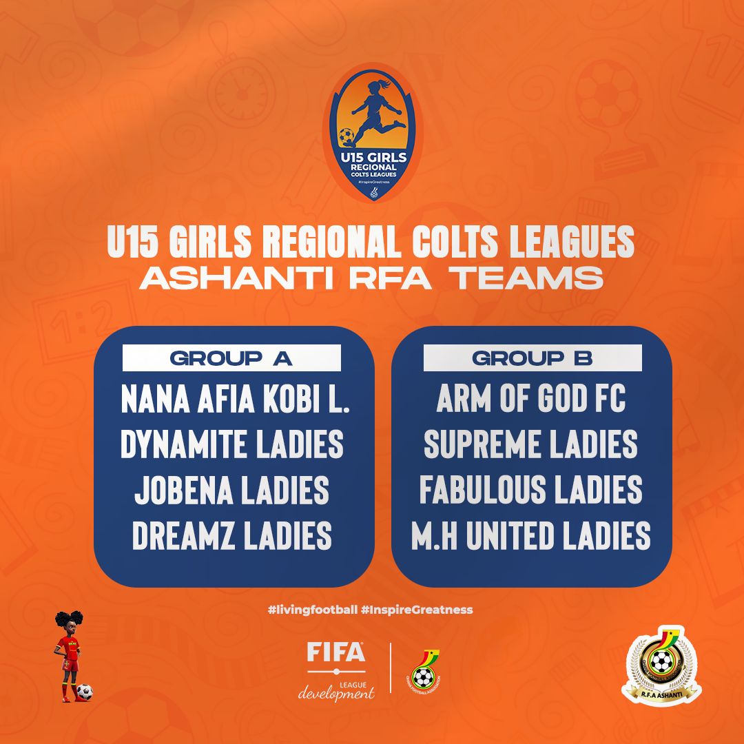 Group A features Nana Afia Kobi Ladies, Dynamite Ladies, Jobena Ladies, and Dreamz Ladies, while Group B is made up of Arm of God FC, Supreme Ladies, Fabulous Ladies, and Ash-Town Ladies.