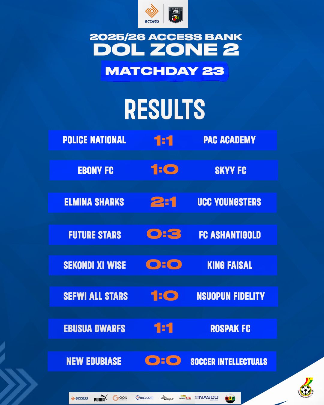 Meanwhile, Ebusua Dwarfs' inconsistent run persisted as they were held to a 1-1 draw by an in-form Sekondi Rospak SC at the Nduom Sports Complex. This result means Dwarfs have dropped points in four of their last five league matches (W1, D3, L1), significantly hindering their title push. Ishmael Bart Addison gave Dwarfs an early lead in the 8th minute, but Francis Havor quickly responded for Rospak just five minutes later. Ebusua Dwarfs remain second on 42 points after 23 games.