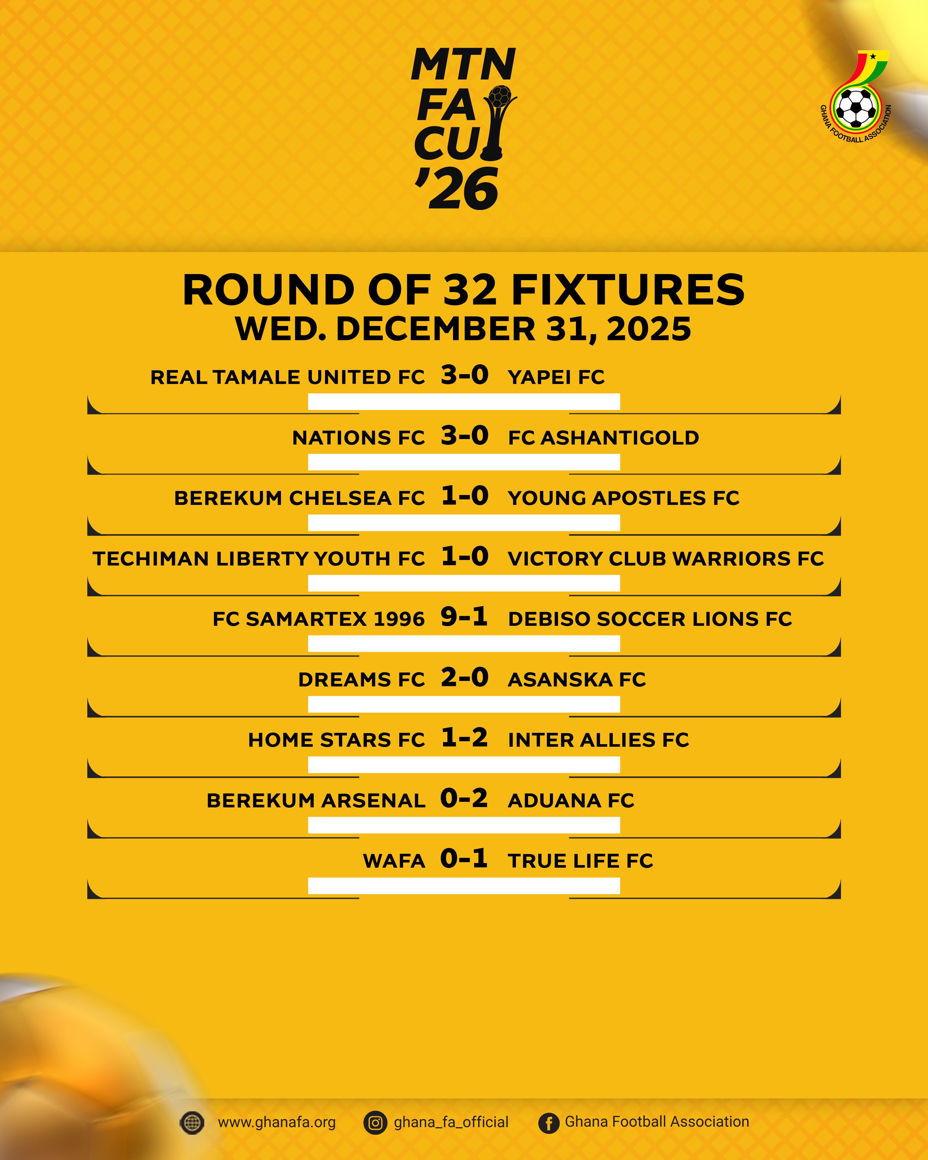 Berekum Chelsea, FC Samartex 1996, Dreams FC, Nations FC, and Aduana FC have progressed to the Round of 16 of the MTN FA Cup. While Chelsea pip Young Apostles, FC Samartex, Dreams FC, Nations FC, and Aduana FC ran riot over Debiso Soccer Lions, Asanska FC, FC AshantiGold ’04, and Berekum Arsenal, respectively.