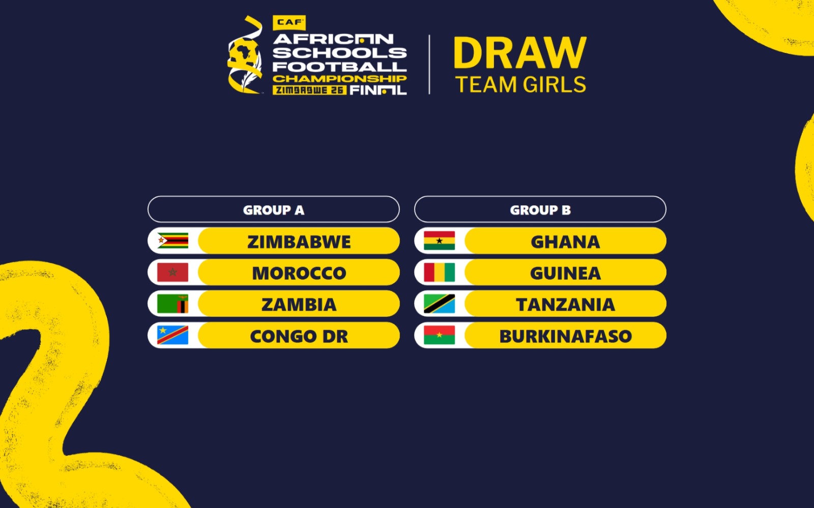 Ghana will face Guinea and Tanzania in Group B, while Group A features hosts Zimbabwe, Morocco, Zambia and Congo DR.