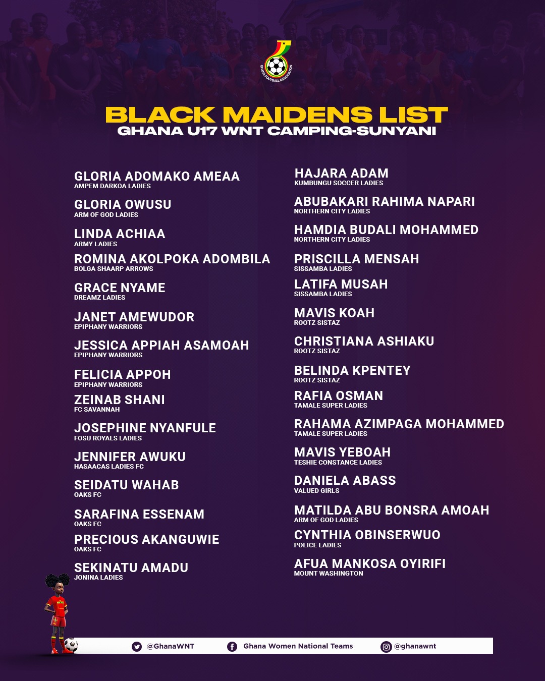 The list also includes several players from powerhouse youth clubs such as Epiphany Warriors, Oaks FC, Rootz Sistaz, and Northern City Ladies, who continue to play pivotal roles in nurturing young female talent.