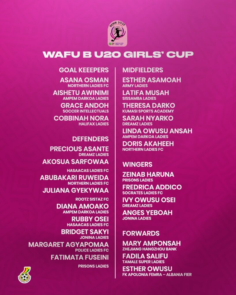 Head coach of Ghana’s female U20 national team, Charles Sampson, has announced a 26-player squad for the upcoming WAFU B U20 Girls’ Cup, scheduled to take place in Cotonou, Benin, from November 3 to 10, 2025.