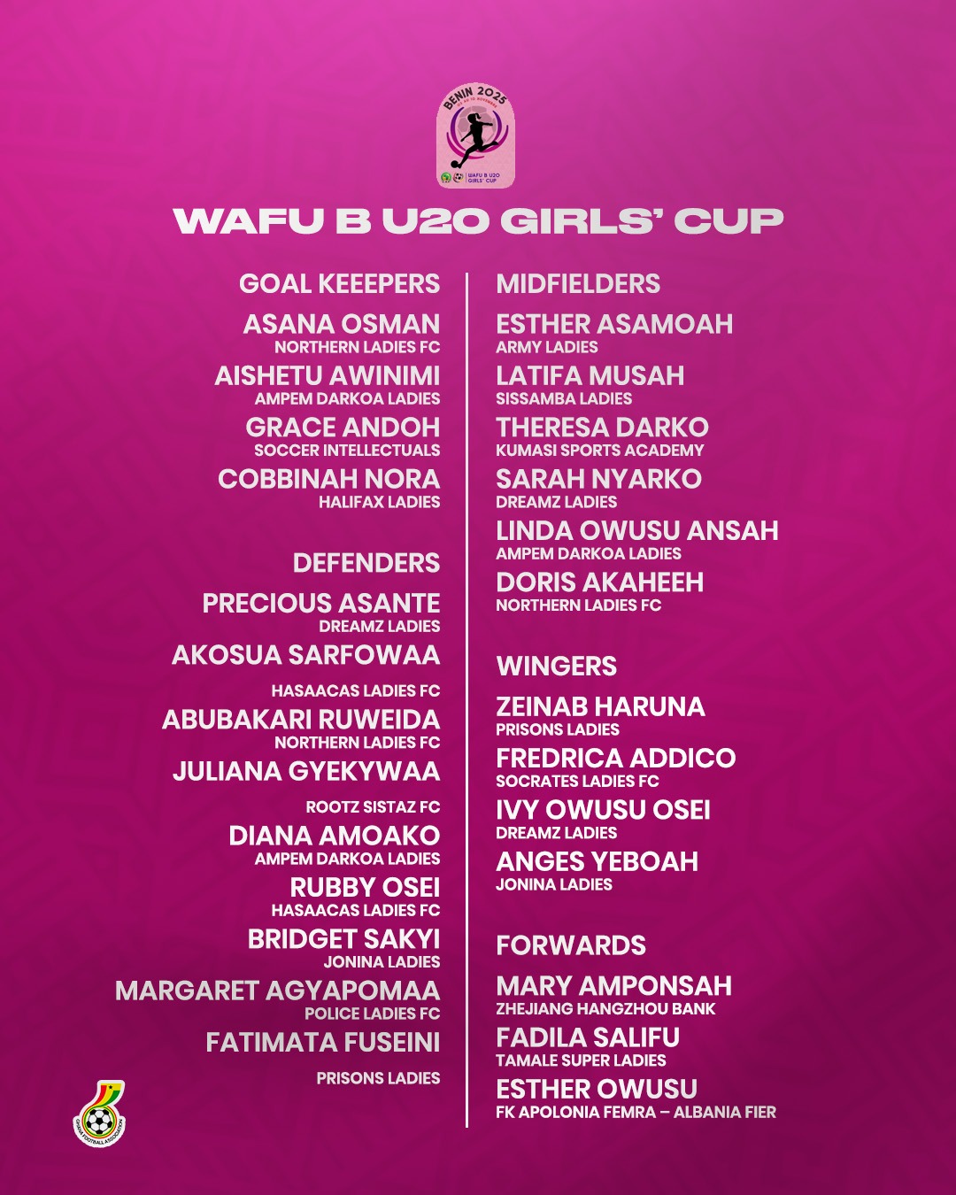 The squad features an exciting young players as the Black Princesses prepare to defend the title they won two years ago. Coach Sampson’s selection includes four goalkeepers, nine defenders, six midfielders, four wingers, and three forwards, reflecting a well-rounded team capable of challenging for honours once again.