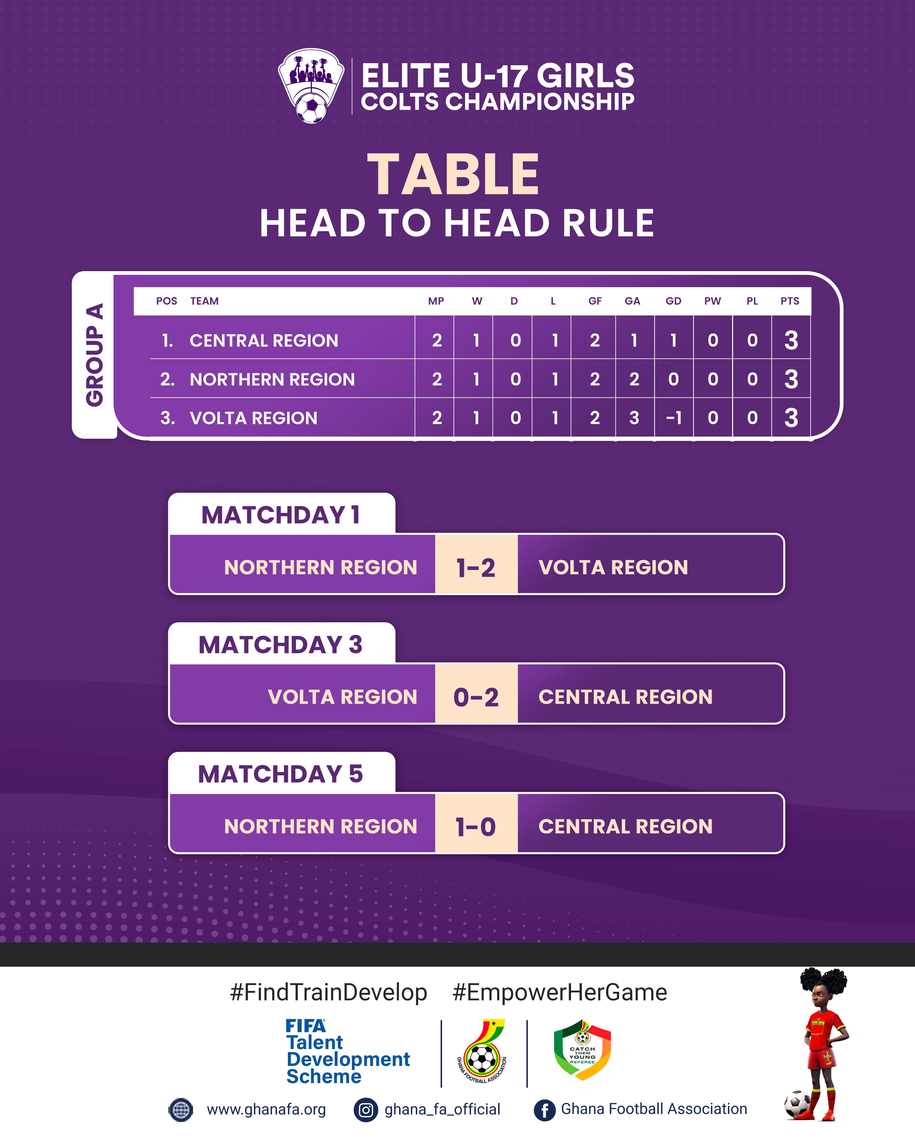 In Group A, Northern, Central, and Volta Regions all finished with 9 points each. Central Region came out on top after applying the GFA head-to-head rule to determine the winner.