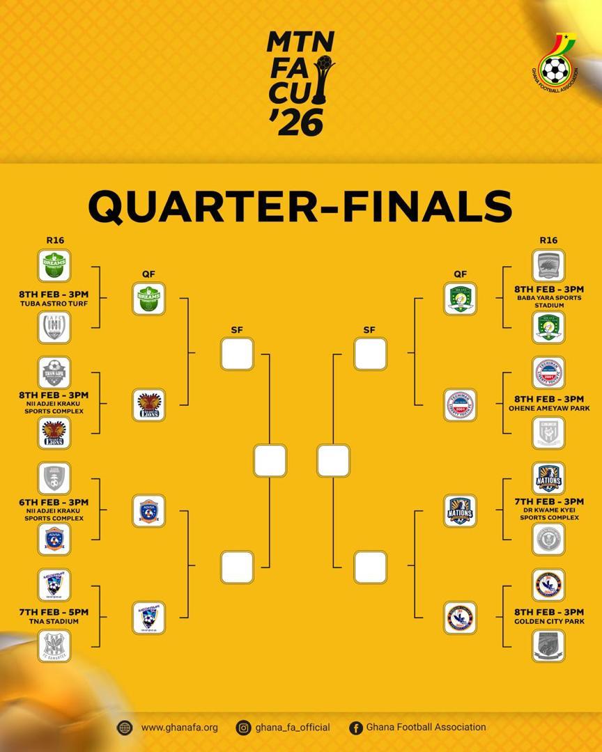 The Competitions Department has confirmed the dates and venues for the four Quarter-Finals of the MTN FA Cup. The eight quarter-finalists will play their matches at the Cape Coast Stadium and the Nana Fosu Gyeabour Park in Techiman on the weekend of March 13-16, 2026.