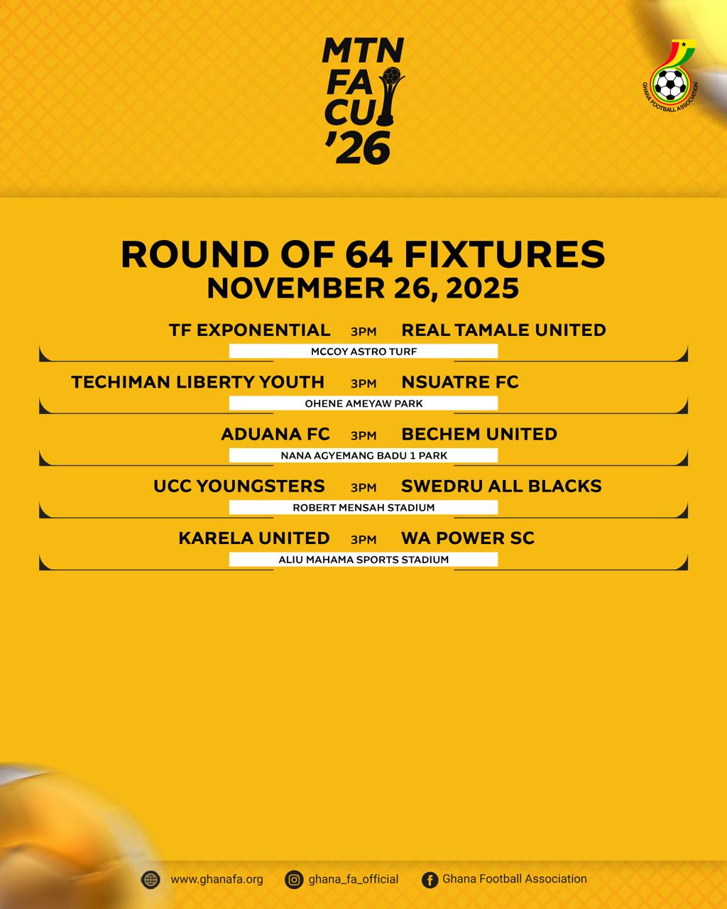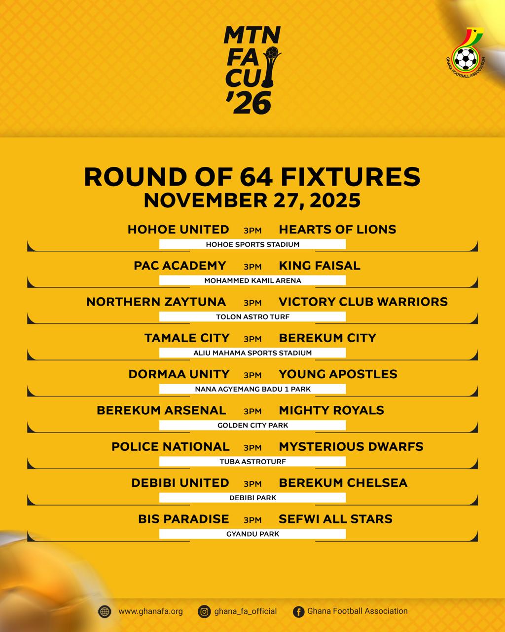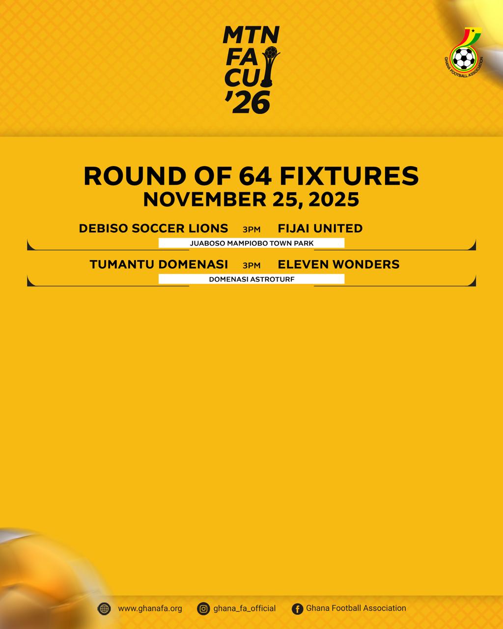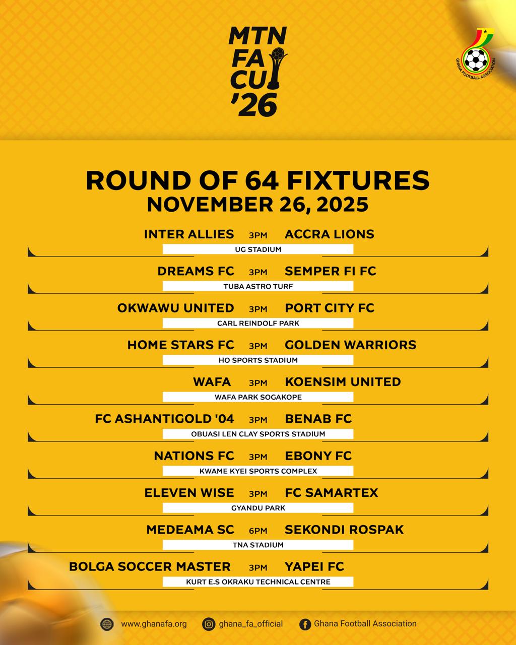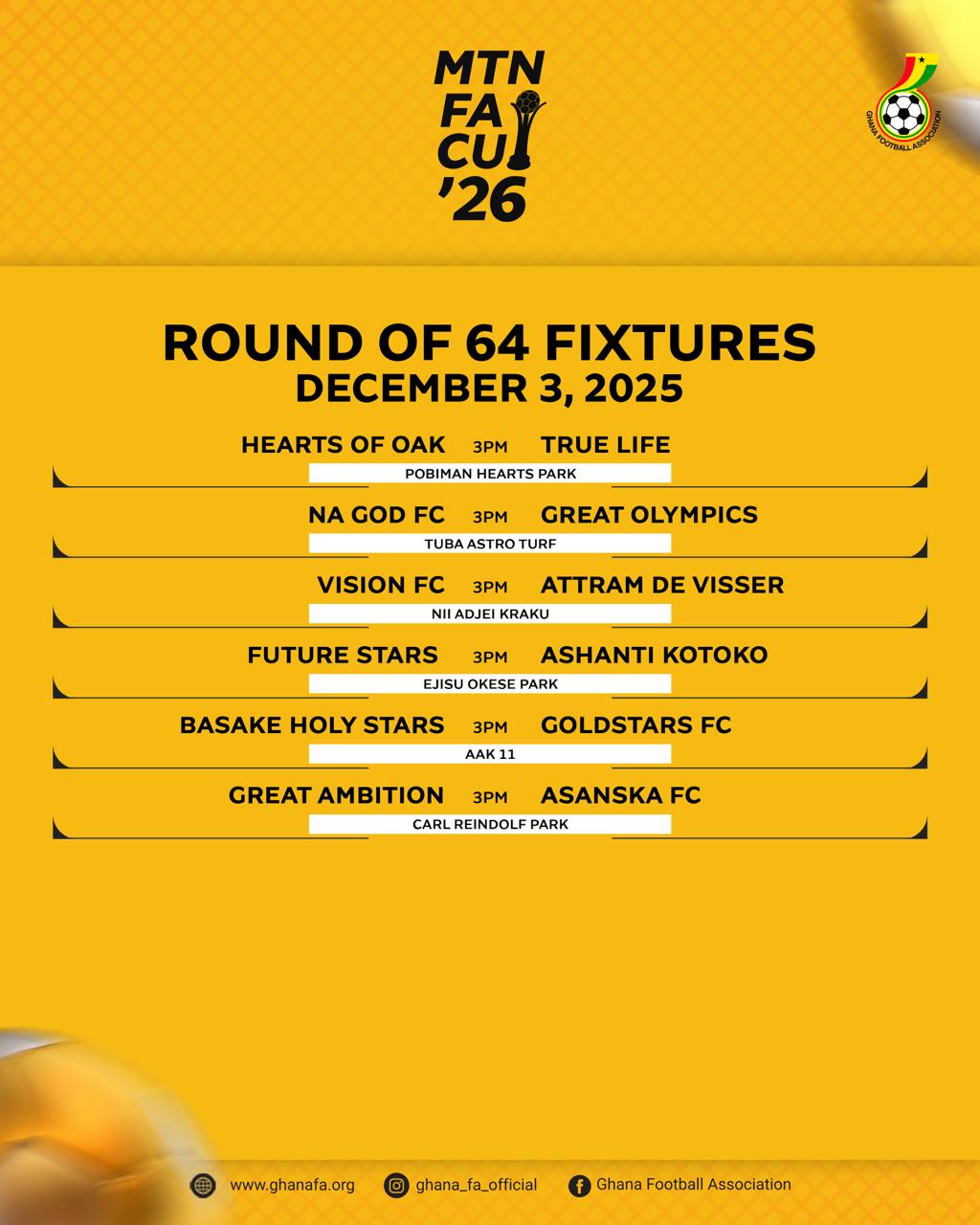 The Competitions Department has announced the dates and venues for the Round of 64 of the MTN FA Cup. Defending Champions Asante Kotoko will travel to Future Stars on Wednesday, December 3, 2025, while Accra Hearts of Oak take on True Life FC at Pobiman Hearts Park. There are two matches on Tuesday, November 25, 2025. Third tier sides Debiso Soccer Lions will face Fijai United while, Tumantu Domenasi battle Premier League side Eleven Wonders. Former Champions Okwahu United will clash with Port City at the Carl Reindorf Park in Dansoman on Wednesday, November 26, 2025. Other top fixtures to look forward to in this Round include Sekondi Eleven Wise vs FC Samartex 1996, Medeama SC vs Sekondi Rospak, Dreams FC vs Semper FI, and Inter Allies vs Accra Lions at the University of Ghana Stadium.