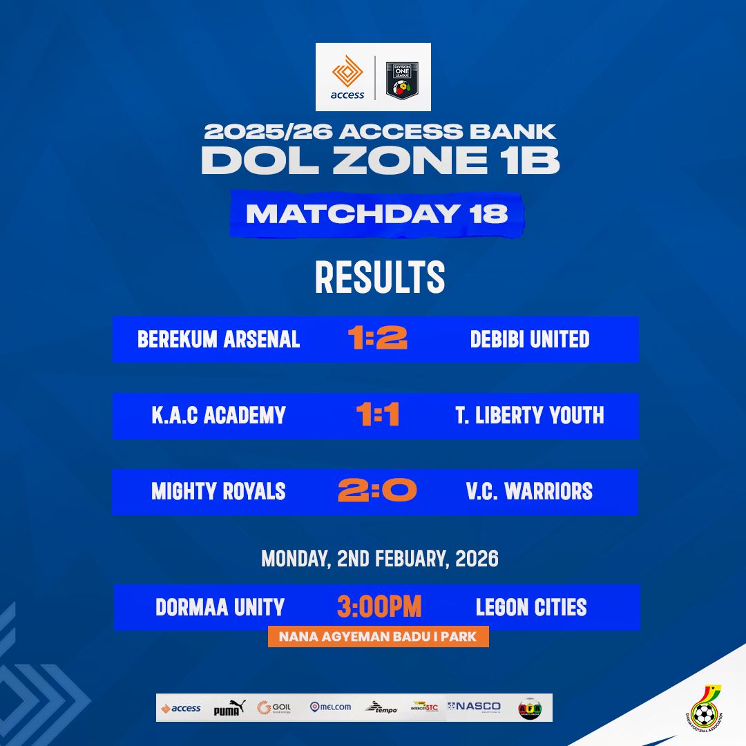Zone One B leaders Debibi United FC continued their impressive league run with a hard-fought 2–1 away victory over former Premier League side Berekum Arsenal at the Golden City Park over the weekend. Kwadwo Antwi opened the scoring for Debibi United just six minutes after kickoff, before Clement Nketiah doubled the lead in the 12th minute. Evans Ankamah pulled one back for Berekum Arsenal in the dying moments of the game, but it proved too late to deny the visitors maximum points. Debibi United FC have now amassed an impressive 44 points from 18 matches and sit on top of the table.