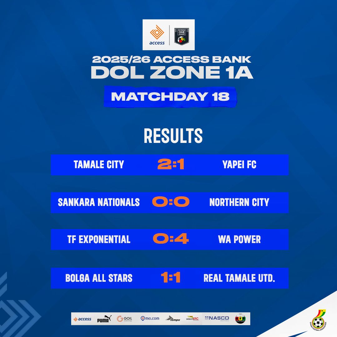 Elsewhere, Zone One A leaders Tamale City FC came from behind to secure a dramatic 2–1 victory over newly promoted Yapei FC at the Aliu Mahama Sports Stadium. The win ensured Tamale City FC remain the only unbeaten side across all three zones after Matchweek 18. Abedi Karim handed Yapei FC an early lead in the 11th minute, but Donatus Akolibila equalised just two minutes later for the hosts. Mohammed Musah Salifu sealed the comeback with the winning goal in the 54th minute. The Citizens are unbeaten in 18 League matches and leads the table in Zone One A with 40 points.