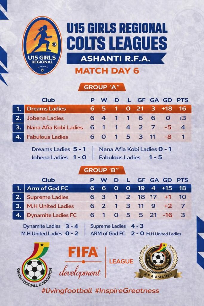 Dreams Ladies and Arm of God Ladies have finished top of their respective groups in the Ashanti Regional U15 Girls Colts League, capping impressive campaigns in the maiden edition of the competition.