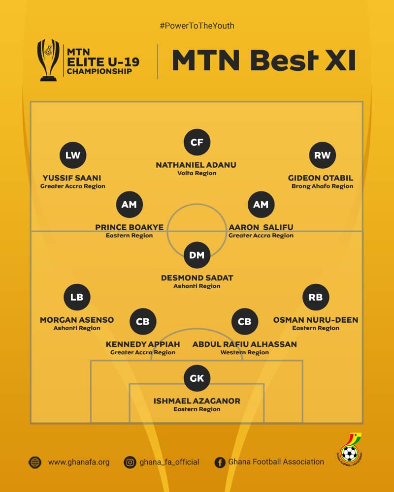 Champions Eastern Region and Greater Accra have emerged as the standout performers in the MTN Elite U19 Team of the Tournament, following the successful conclusion of the maiden edition on Sunday, November 2, 2025. The Team of the Tournament, selected by a technical study group, comprises one goalkeeper, four defenders, three midfielders (two attacking and one defensive), two wingers and one centre forward. Tournament winners Eastern Region lead the selections with three players: Ishmael Azaganor (Goalkeeper), Osman Nuru-Deen (Right-Back) and Prince Boakye (Attacking Midfielder). Greater Accra also produced three outstanding performers, Kennedy Appiah (Defender), Aaron Salifu (Attacking Midfielder) and Yussif Saani (Left Winger). Ashanti Region followed closely with two representatives, Morgan Asenso (Left-Back) and Desmond Tutu (Defensive Midfielder), both of whom impressed with their tactical discipline and composure on the ball. The remaining spots were filled by players from Western, Brong Ahafo and Volta Regions, with Abdul Rafiu Alhassan (Centre-Back – Western), Gideon Otabil (Right Winger – Brong Ahafo) and Nathaniel Adanu (Centre Forward – Volta) completing the elite lineup. Eastern Region wrote their name into the history books as the first-ever champions of the MTN Elite U19 Championship, defeating Brong Ahafo in a tense penalty shootout at the Ghanaman Soccer Centre of Excellence. The championship featured ten regional teams from across Ghana and served as a vital platform for young footballers to showcase their talent, gain valuable competitive experience, and attract the attention of national selectors and professional scouts. GFA Communications