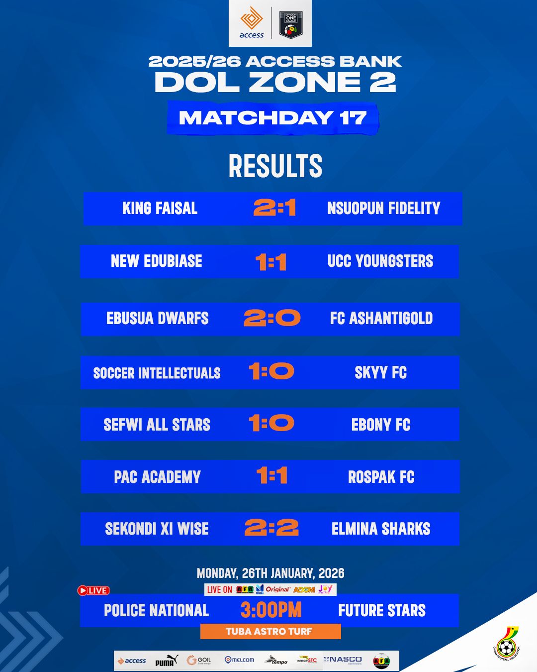Meanwhile, Nsuopun Fidelity FC suffered a 2-1 loss to King Faisal at the Baba Yara Sports Stadium. Suraj Ibrahim broke the deadlock in the 55th minute, before Kingsley Osei Kwadwo doubled King Faisal’s advantage in the 80th minute. Samuel Kofi Osei pulled one back for Nsuopun Fidelity FC in stoppage time, but it was only a consolation as the hosts held on for victory. The result marked Nsuopun Fidelity FC’s third successive away defeat of the season.