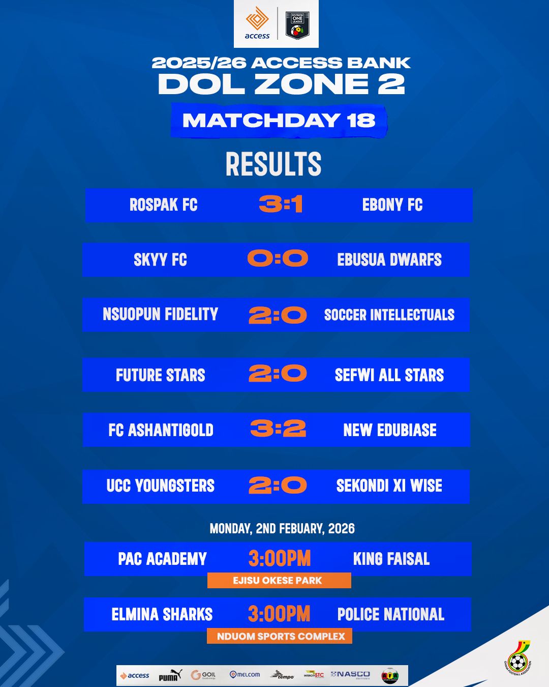 Meanwhile, Sekondi Rospak SC extended their unbeaten run to five matches with a convincing 3–0 home victory over struggling Ebony FC at the Tarkwa and Aboso Stadium on Sunday. Derrick Junior Asare opened the scoring in the 11th minute, before Ruben Tetteh doubled the advantage from close range in the 80th minute. Stephen Anthony Kofi wrapped up the win with a stunning goal seven minutes later. The victory propelled Sekondi Rospak SC into third place in the league table with 32 points.