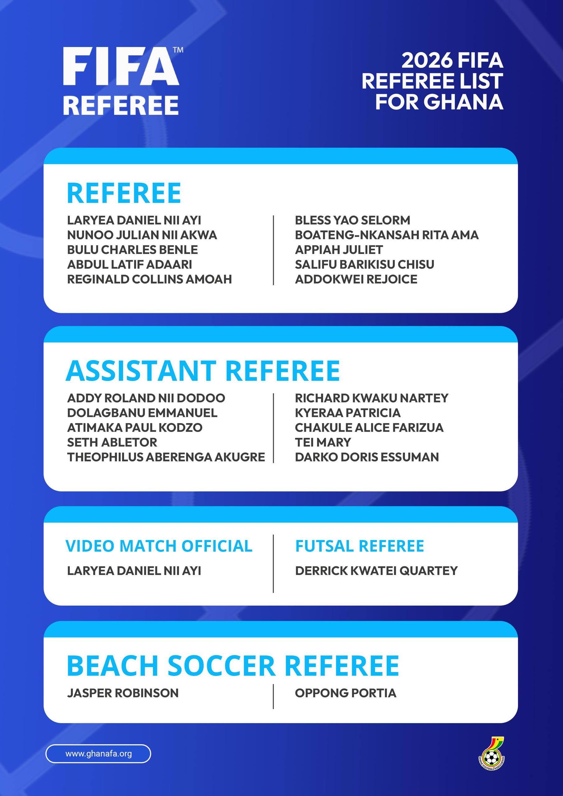 The approved list features a total of 23 officials, comprising 10 Centre Referees, 10 Assistant Referees, one Futsal Referee, one Beach Soccer Referee and one Video Assistant Referee (VAR). Leading the contingent is experienced official Daniel Laryea, who earns recognition both as a Centre Referee and a Video Assistant Referee. The list also includes new assistant referee Richard Kwaku and Portia Oppong, who makes the cut for Beach Soccer officiating.