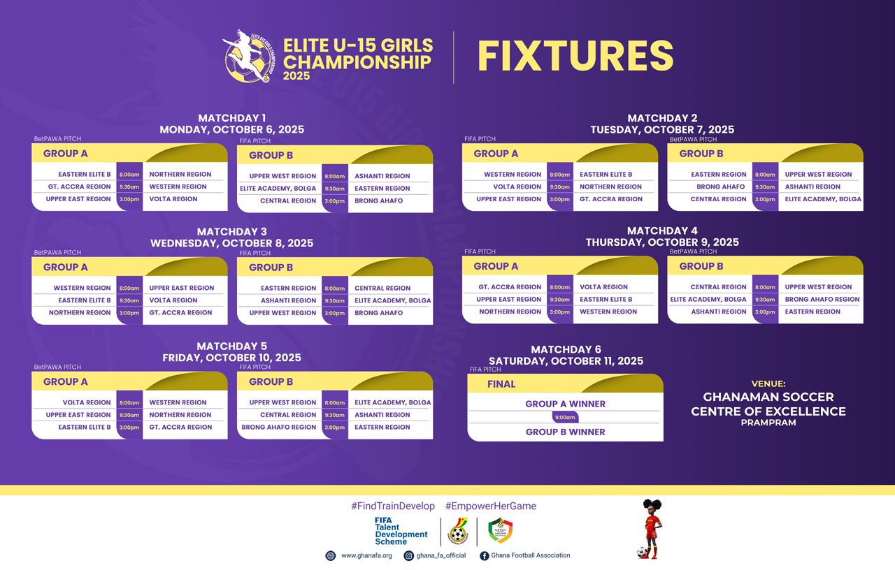The fixtures for the Elite U-15 Girls Championship 2025, scheduled to take place from 5th to 11th October 2025 at the Ghanaman Soccer Centre of Excellence, Prampram has been released.