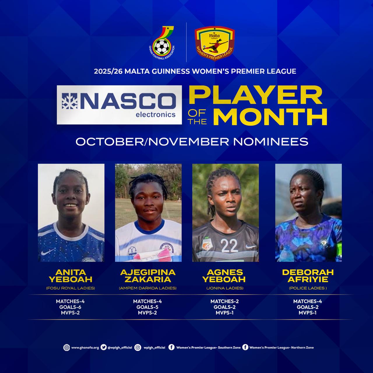 The shortlist for the Nasco player of the month award for October/November in the 2025/26 Malta Guinness Women’s Premier League has been announced, with four standout performers earning recognition for their exceptional early-season form. The nominees include Anita Yeboah (Fosu Royal Ladies), Ajegipina Zakaria (Ampem Darkoa Ladies), Agnes Yeboah (Jonina Ladies), and Deborah Afriyie (Police Ladies), a group whose numbers underline their influence across both the Southern and Northern Zones.
