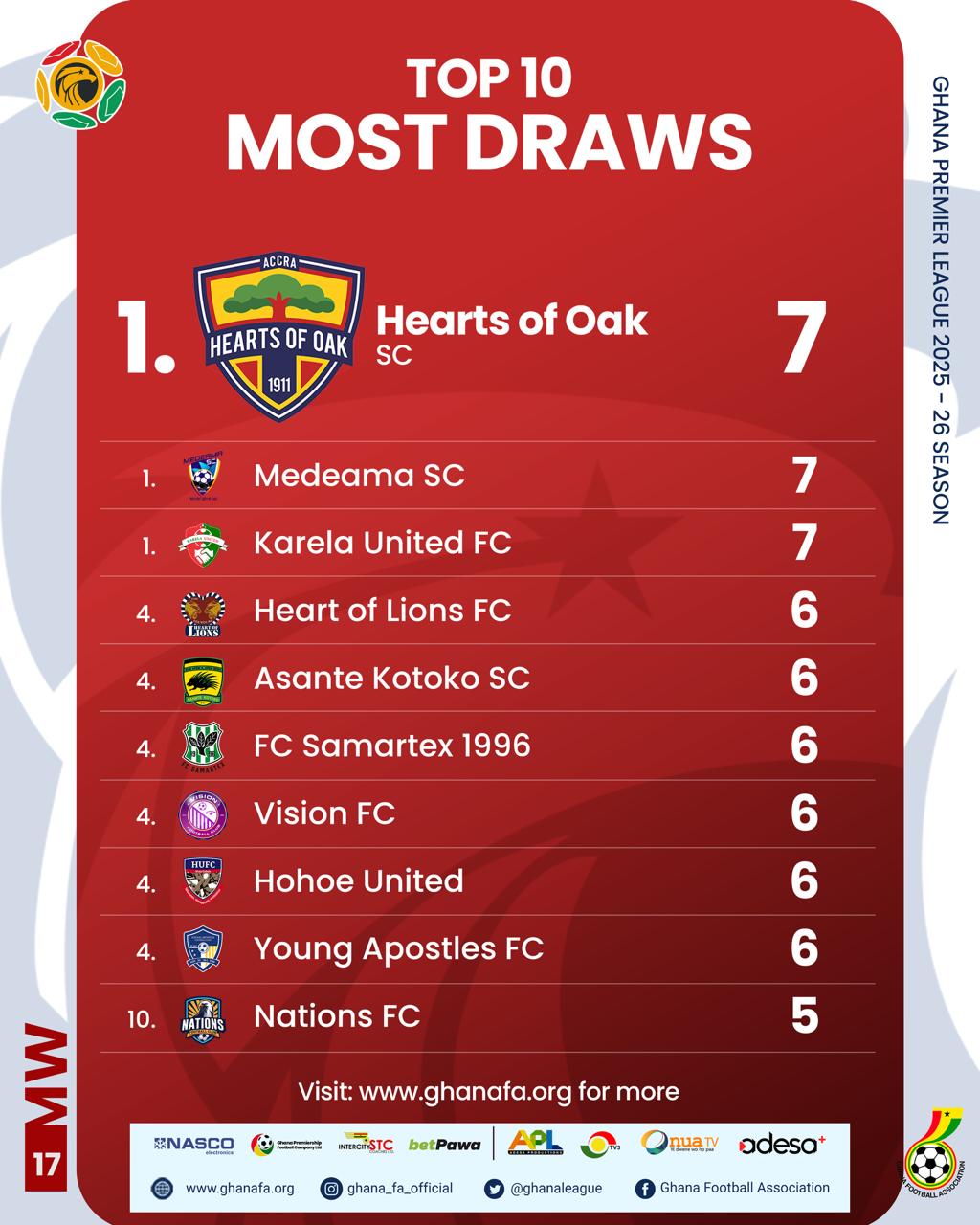 Asante Kotoko and Hearts of Oak have maintained their respective positions from last season’s first round. Kotoko finished 3rd last season with 31 points and remain 3rd this season, albeit with a slight drop to 30 points. Hearts of Oak also held on to 5th place, with their points tally reducing marginally from 29 to 28.