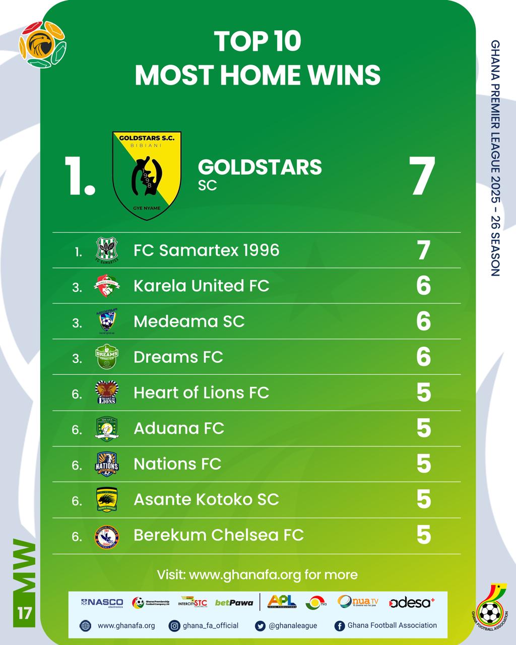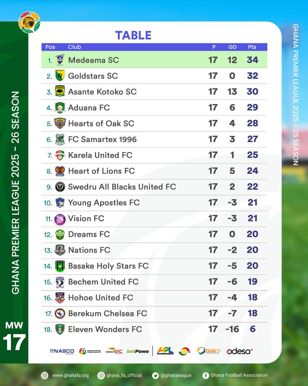 Medeama SC ended the first round of the Ghana Premier League as league leaders with 34 points, just one point more than last season’s first-round leaders, Gold Stars, who topped the table with 33 points. Gold Stars have shown remarkable consistency, recording 33 points last season and 32 points in the first round of the current campaign.