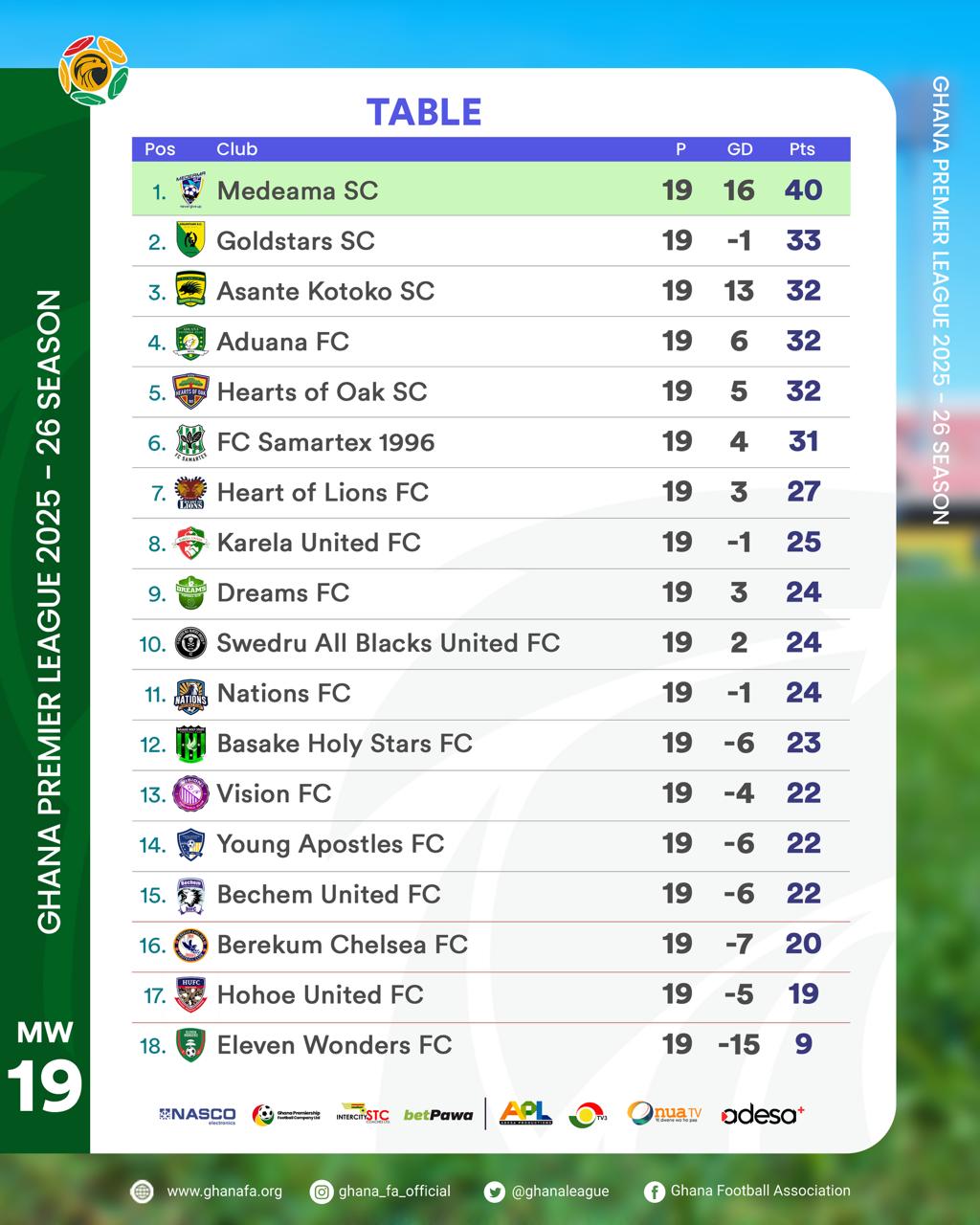 Ghana Premier League after matchday 19 has produced some interesting statistics, with a total of 171 matches played so far. Out of these games, there have been 95 home wins, 24 away wins and 52 draws. A total of 316 goals have been scored in the league, with home teams accounting for 215 goals while away teams have netted 101.