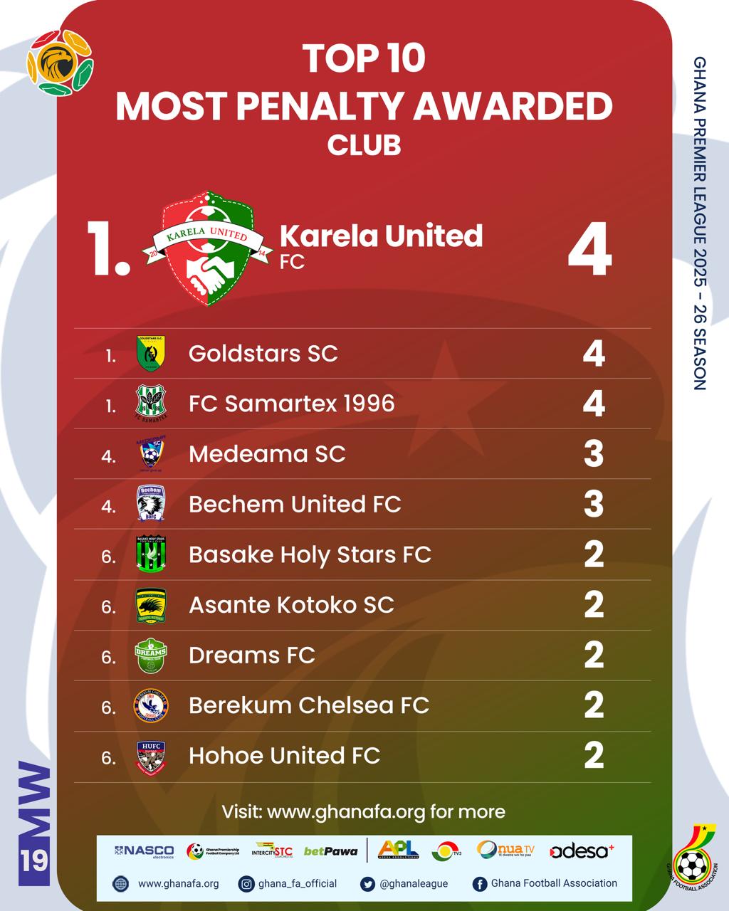 In terms of penalties awarded, Karela United, Bibiani Gold Stars and FC Samartex lead the chart, having each been awarded four penalties, the highest in the league. On the clean sheets chart, Zakari Musah tops the list with 11 clean sheets, the most in the competition, while Lawrence Osei of Heart of Lions, Felix Kyei of Medeama SC and Mohammed Camara of Asante Kotoko have all kept nine clean sheets each. Emmanuel Kobi of Bibiani Gold Stars follows closely with eight clean sheets.