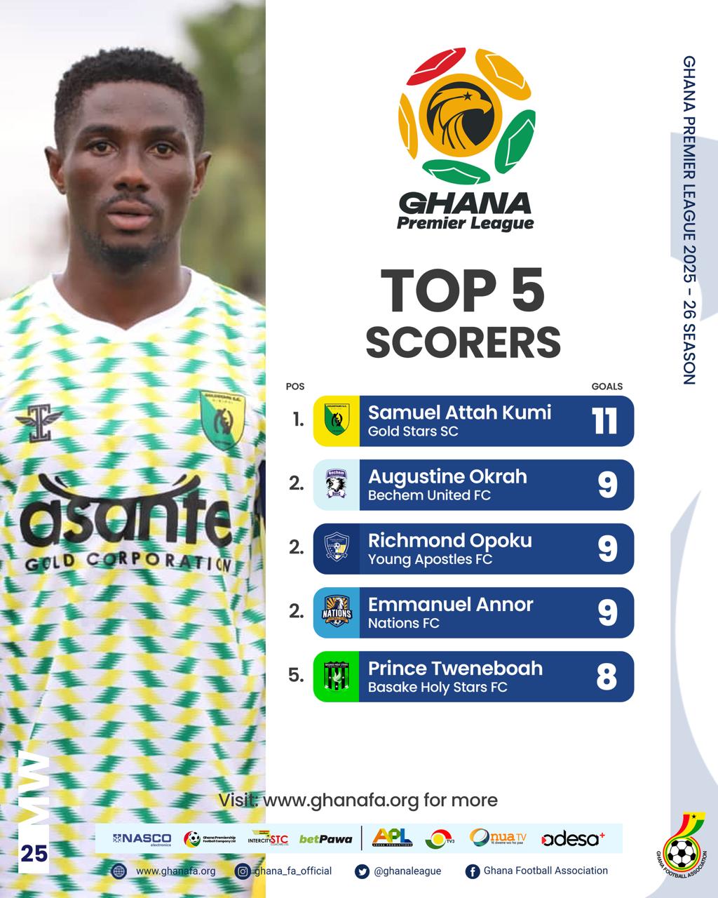 Meanwhile, Samuel Attah Kumi continues to lead the top scorers’ chart with 11 league goals for Bibiani Gold Stars FC this season.