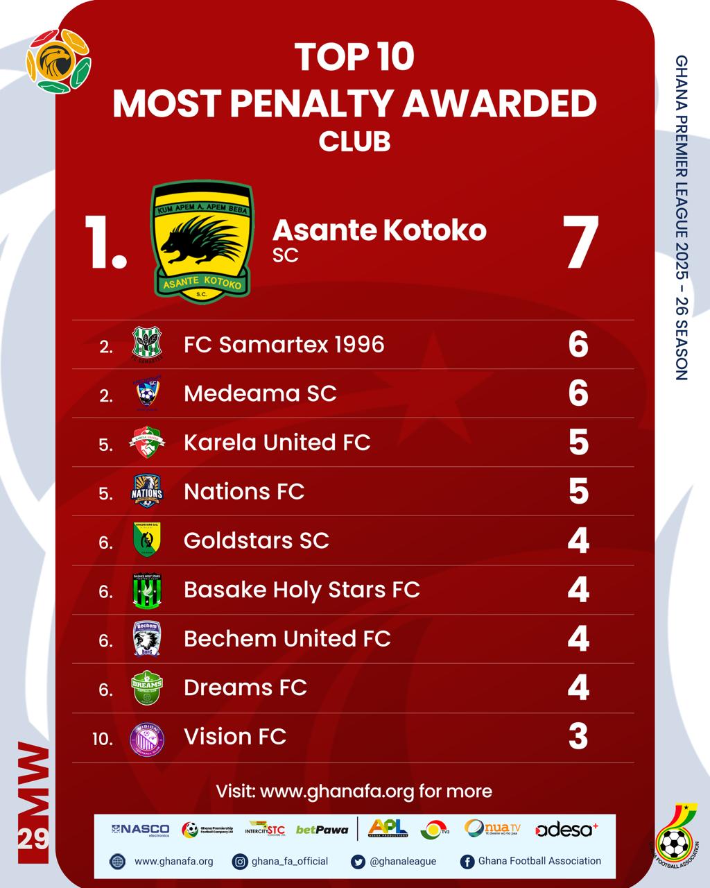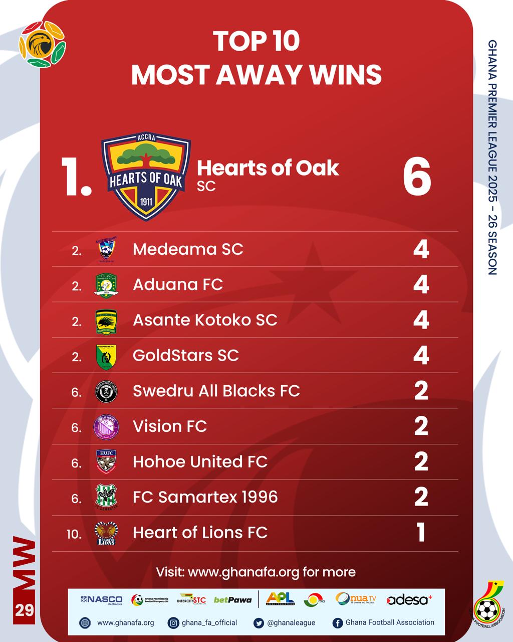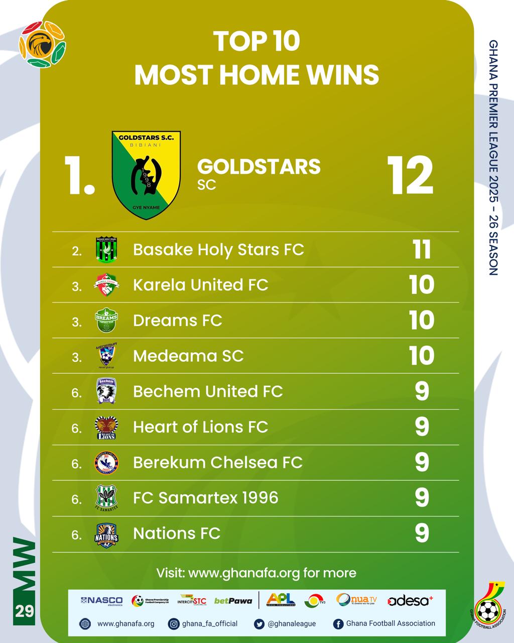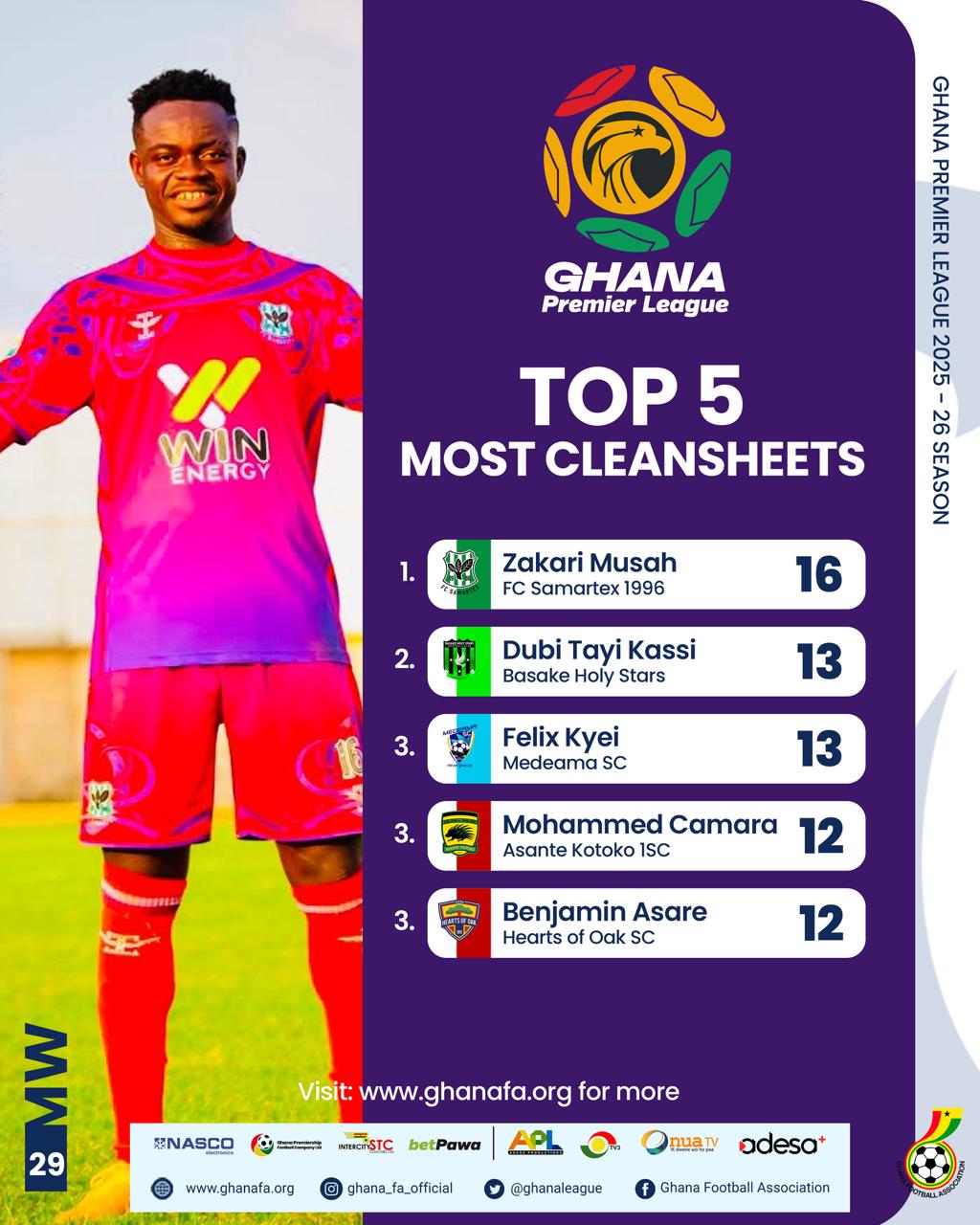 On the individual front, Samuel Atta Kumi of Gold Stars SC leads the top scorers’ chart with 12 goals. He is closely followed by Augustine Okrah of Bechem United FC and Richmond Opoku of Young Apostles FC, who both have 11 goals. Suraj Seidu of Dreams FC comes next with 10 goals, while Salim Adams of Medeama SC rounds out the top five with 9 goals.