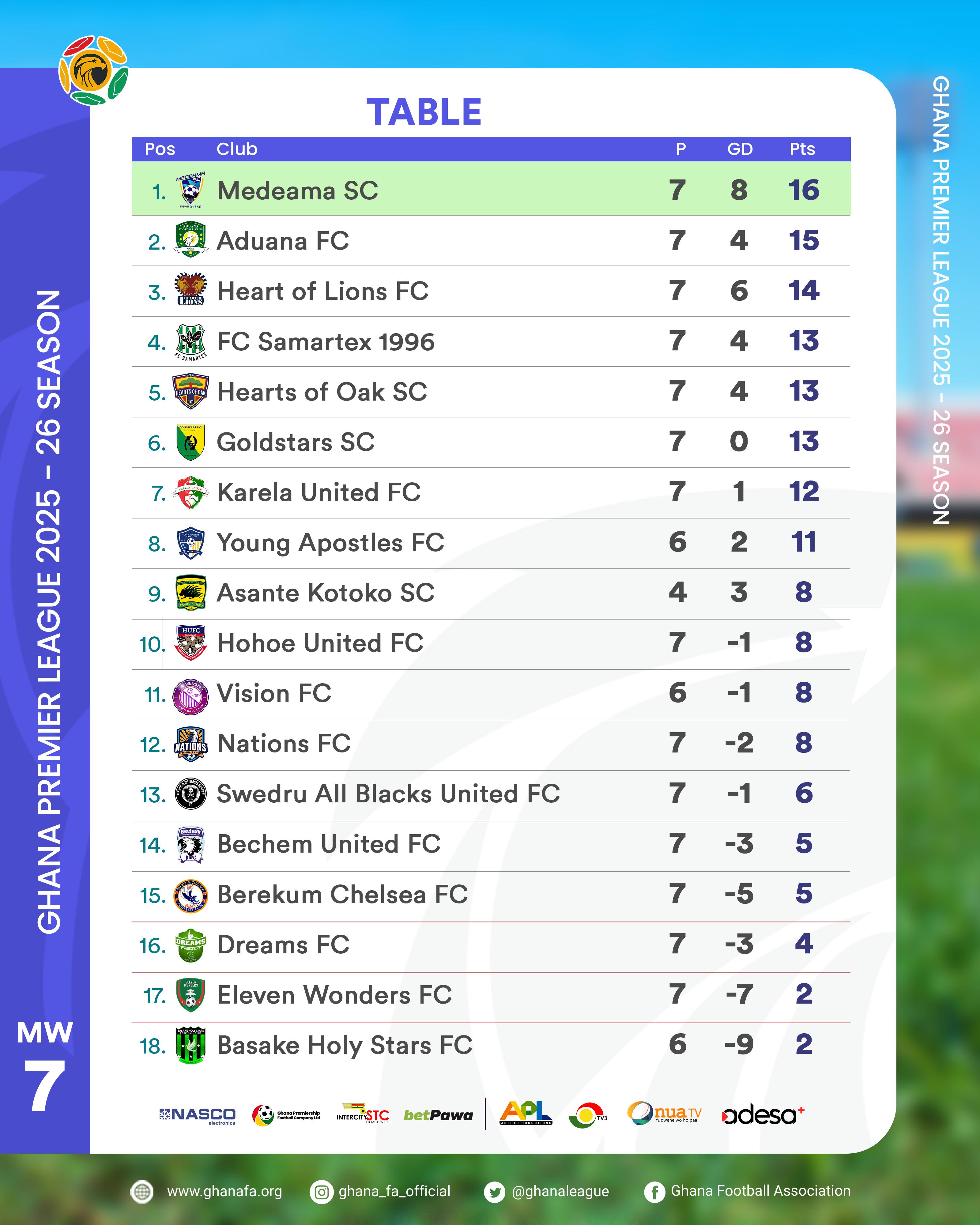 Medeama SC currently sits at the top of the league table with 16 points, closely followed by Aduana FC in second place with 15 points. The race for the top spot remains wide open, with Heart of Lions and FC Samartex also within touching distance of the leaders. The competitiveness at the top end of the table highlights the balance of quality and determination across the league this season.