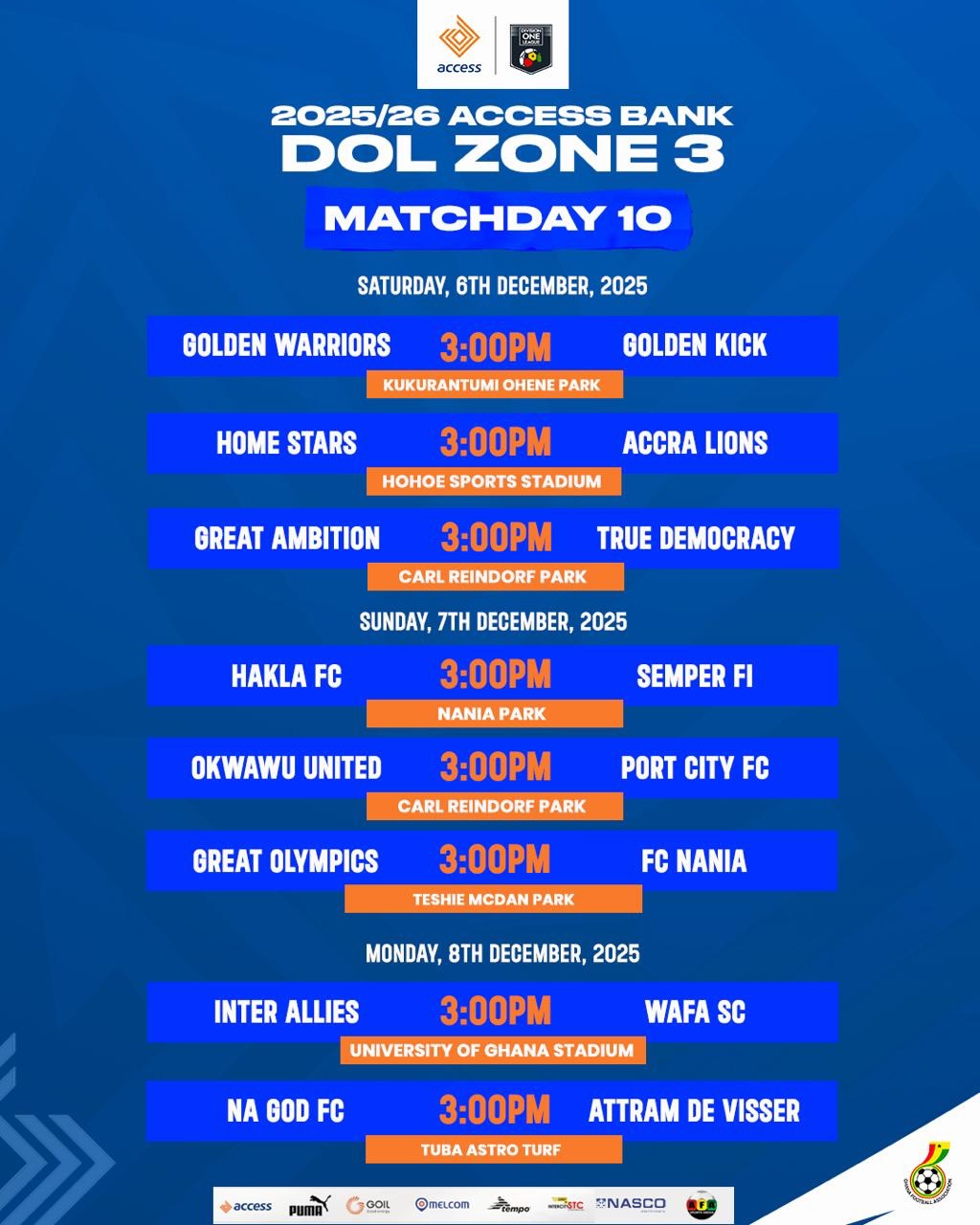 Accra Great Olympics will host FC Nania, while Inter Allies lock horns with WAFA SC at the University of Ghana Stadium on Monday, December 8, 2025.