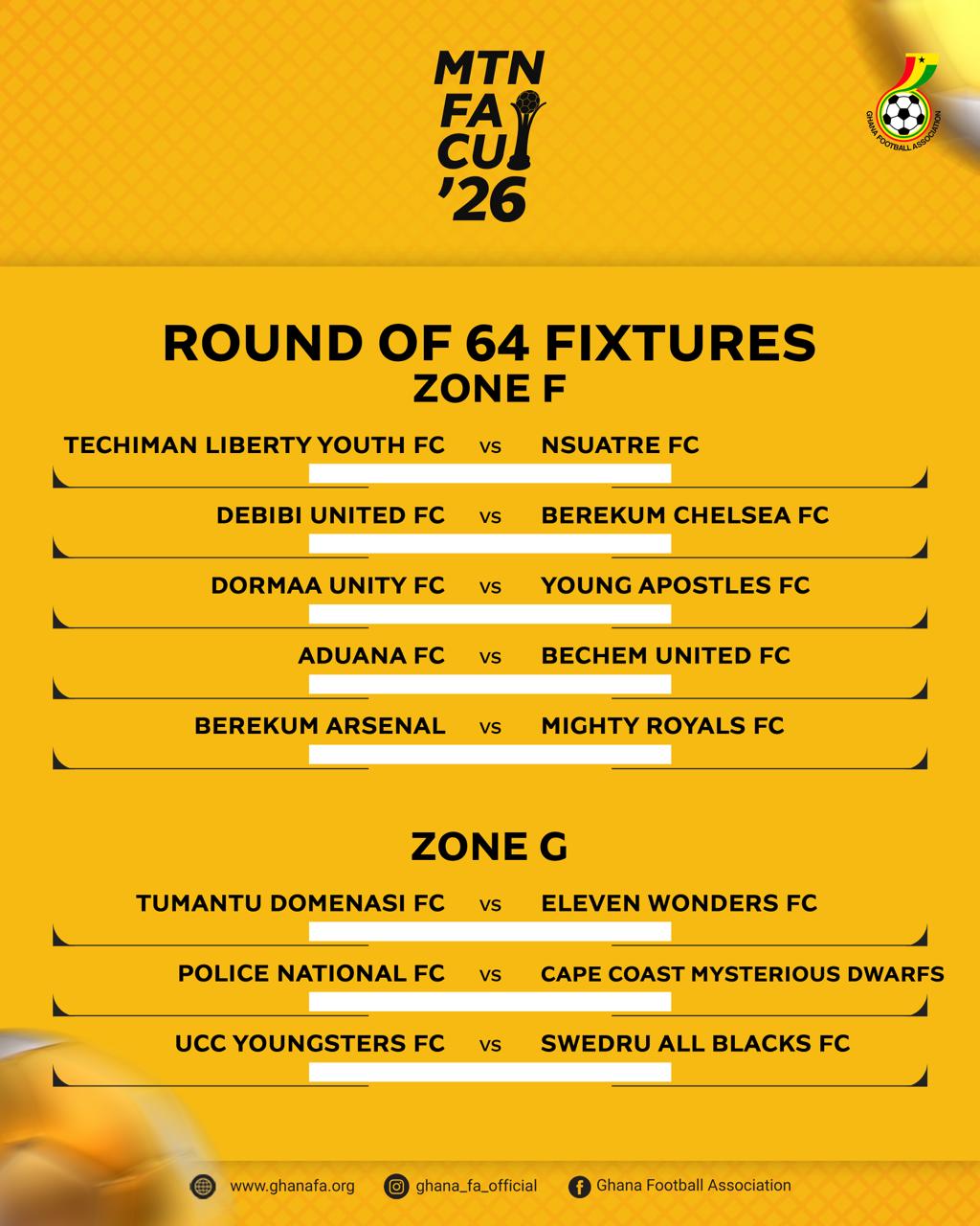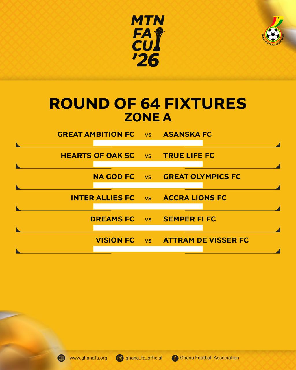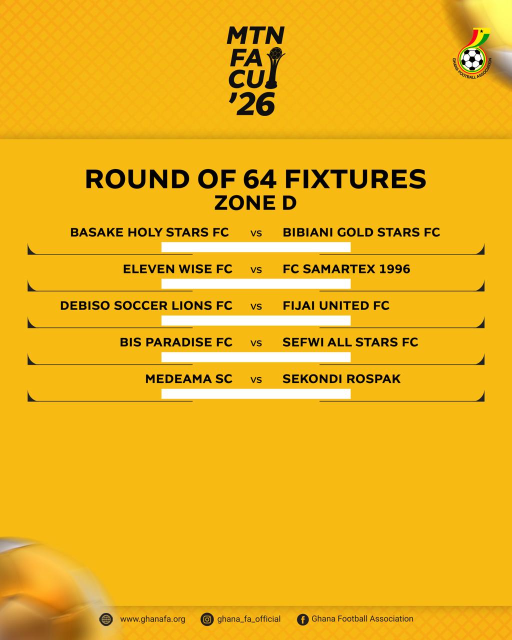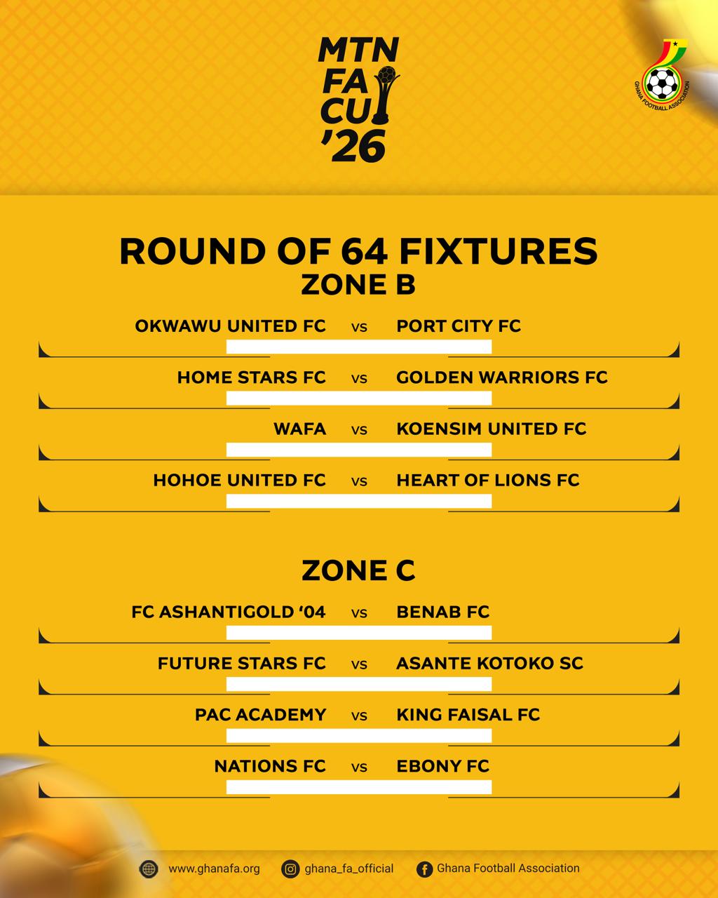 Defending champions Asante Kotoko have been paired with Division One League side Future Stars in the Round of 64 of the MTN FA Cup, as revealed at the draw on Friday, November 14, 2025. Two-time winners Medeama SC will face Rospak FC, while Sekondi Eleven Wise has been paired with Premier League side FC Samartex 1996. Record holders Accra Hearts of Oak will square off against third-tier side True Life FC, and Na God FC and Dreams FC will face Accra Great Olympics and Semper FI, respectively.