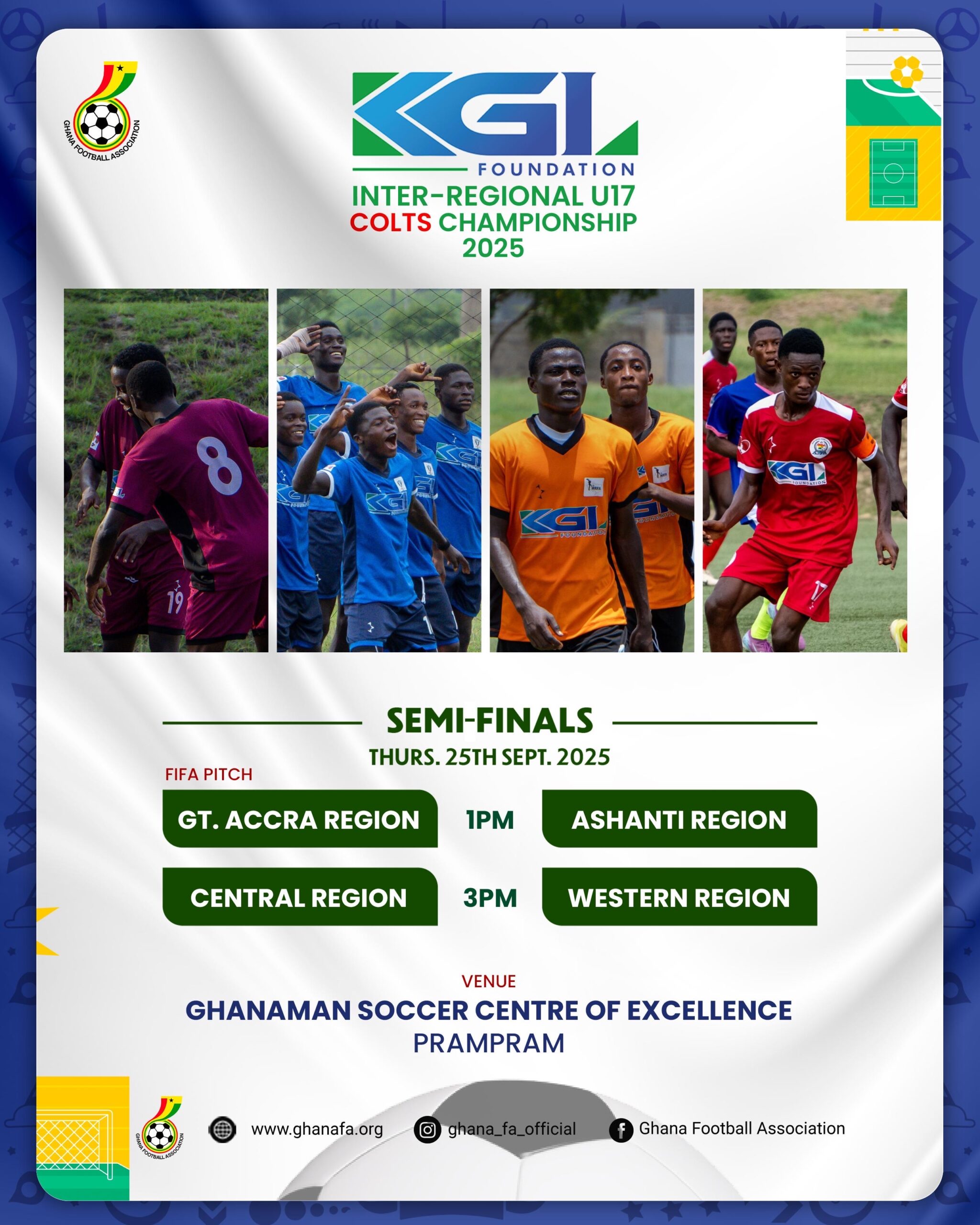 The 2025 KGL U17 Inter-Regional Colts Championship reaches a thrilling climax on Thursday, September 25, at the Ghanaman Soccer Centre of Excellence in Prampram, with two blockbuster semi-final fixtures set to decide the finalists.