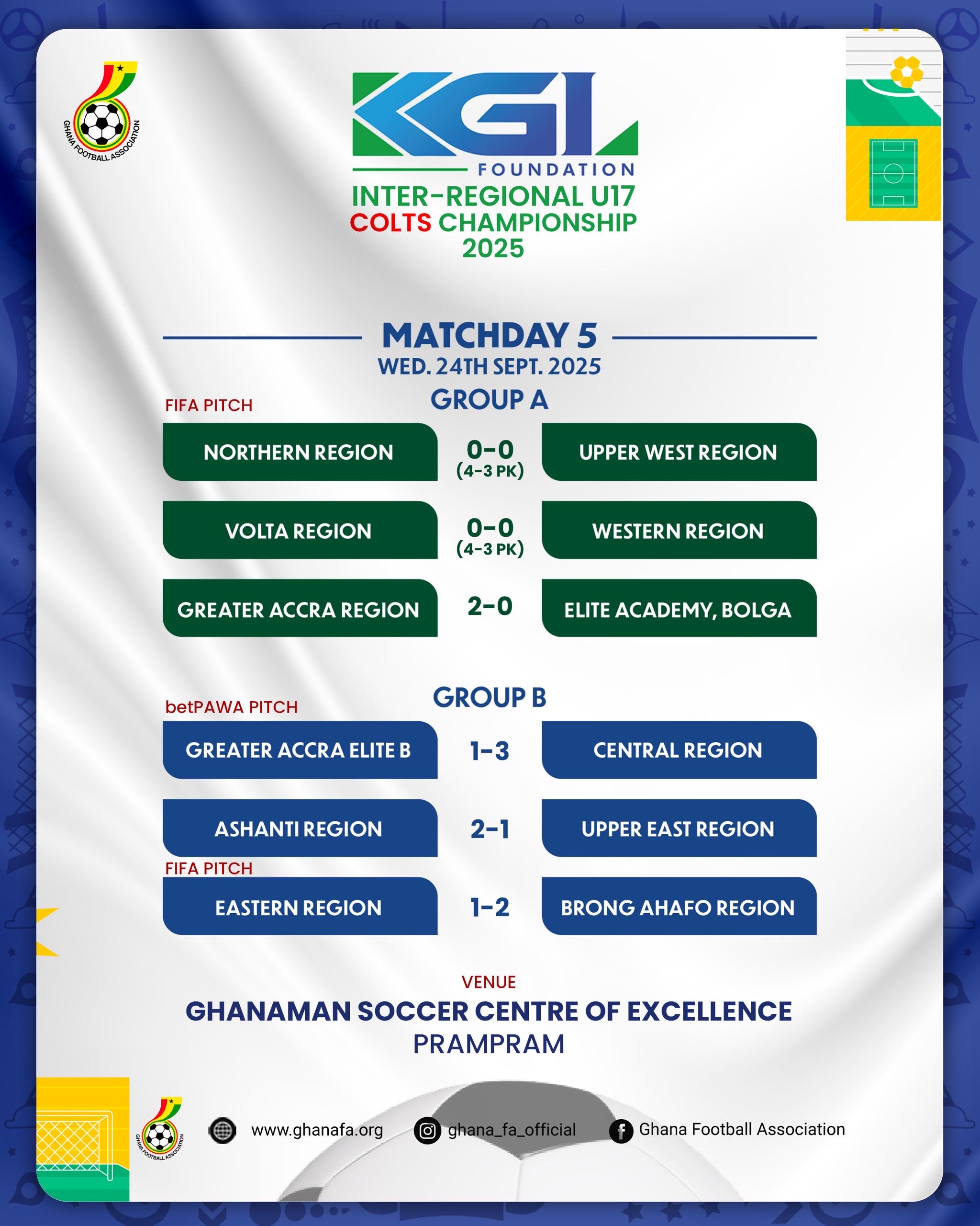 Greater Accra capped an impressive group-stage campaign with a clinical 2–0 victory over Elite Academy (Bolga) on Wednesday, September 24, to finish unbeaten at the 2025 KGL U17 Inter-Regional Colts Championship.