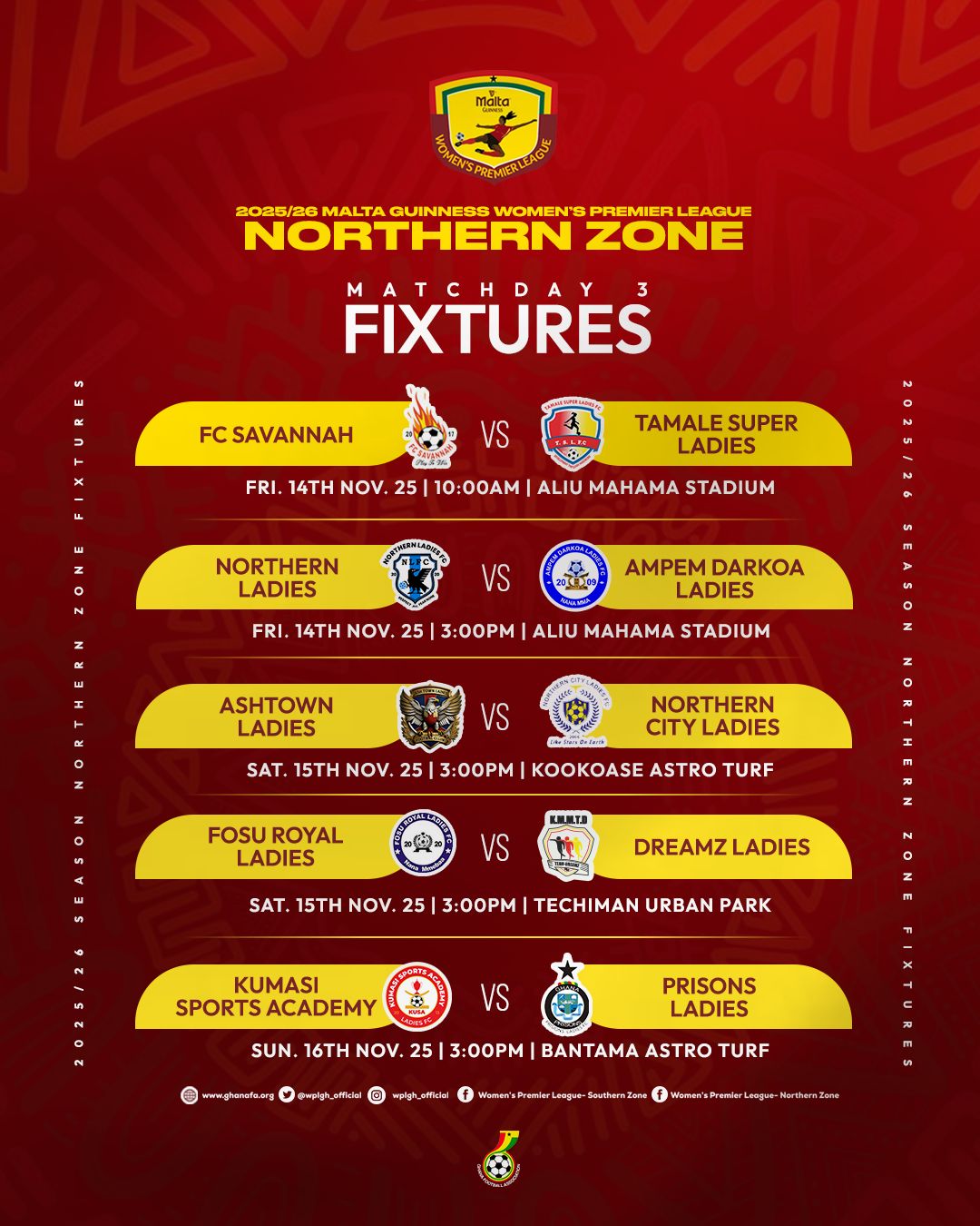 Ampem Darkoa ladies are back on the road as they travel to Tamale to play Northern Ladies. Fosu Royal Ladies host Dreamz Ladies at their new home grounds, Urban park in Tamale. Kumasi Sports Academy face a huge test in Prisons Ladies as they search for their first win.