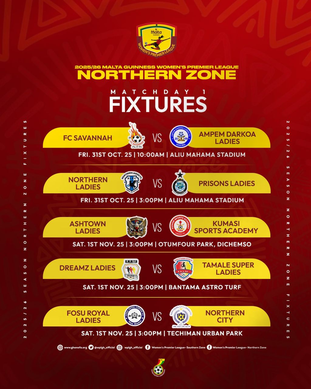 The 2025/26 Malta Guinness Women’s Premier League kicks off across the country this weekend after months of rest and adequate preparation from all the competing clubs. In the Northern Zone, former champions Ampem Darkoa will aim to reclaim the title they lost to Police Ladies last season. Techiman Ladies will begin their campaign away from home as they visit FC Savannah in Tamale on Matchday One.