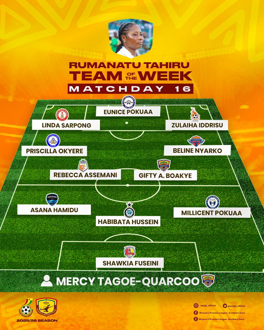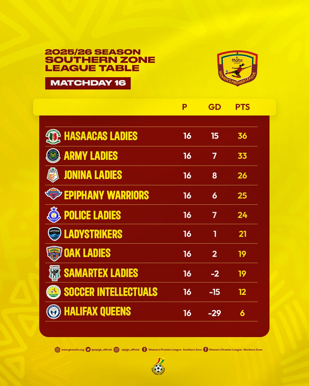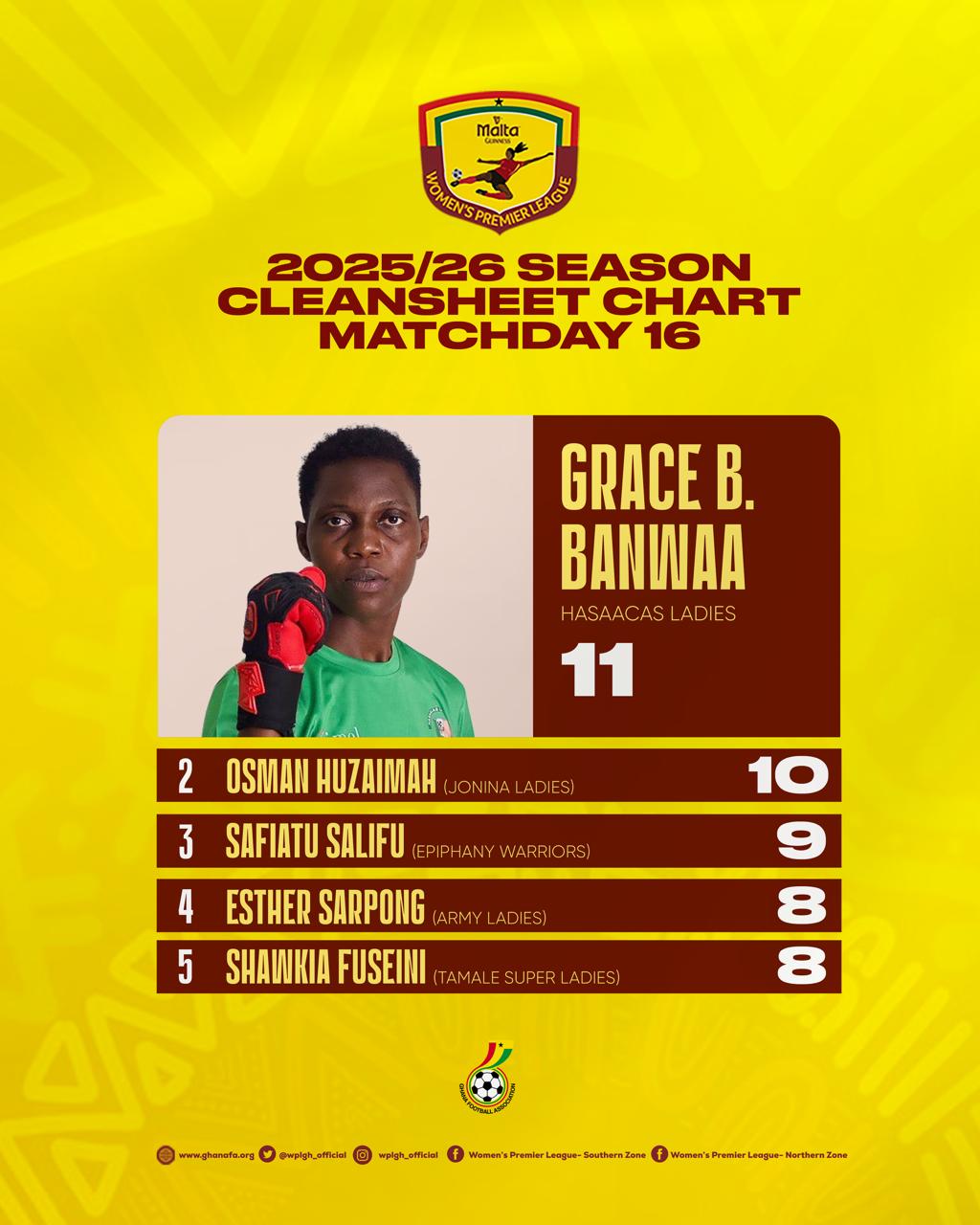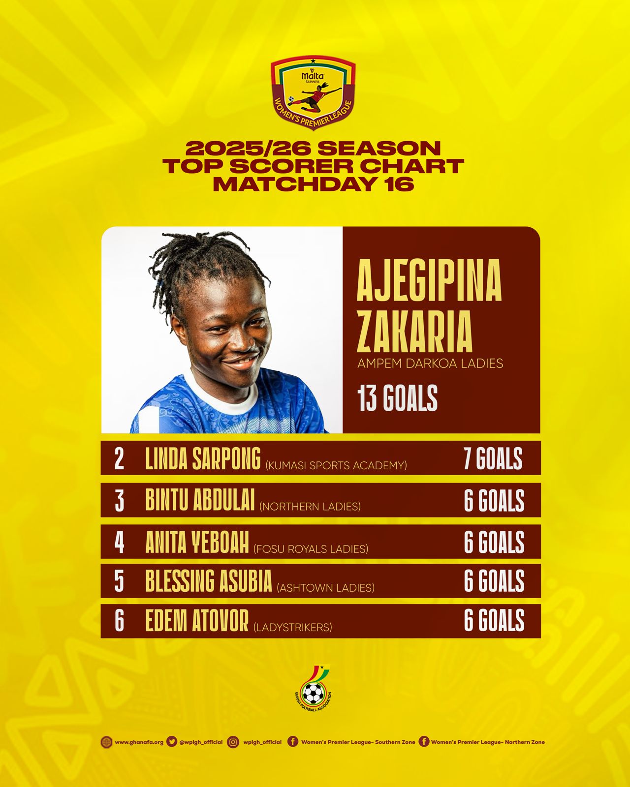 A total of 160 matches have been played in the Malta Guinness Women’s Premier League after Matchday 16, with Hasaacas Ladies topping the Southern Zone table and Ampem Darkoa Ladies leading the Northern Zone. Currently, Ajegipina Zakaria of Ampem Darkoa Ladies tops the goal scorers’ chart with 13 goals in 13 matches, while Grace Boadu Banwaa of Hasaacas Ladies has recorded the most clean sheets so far, with 11.