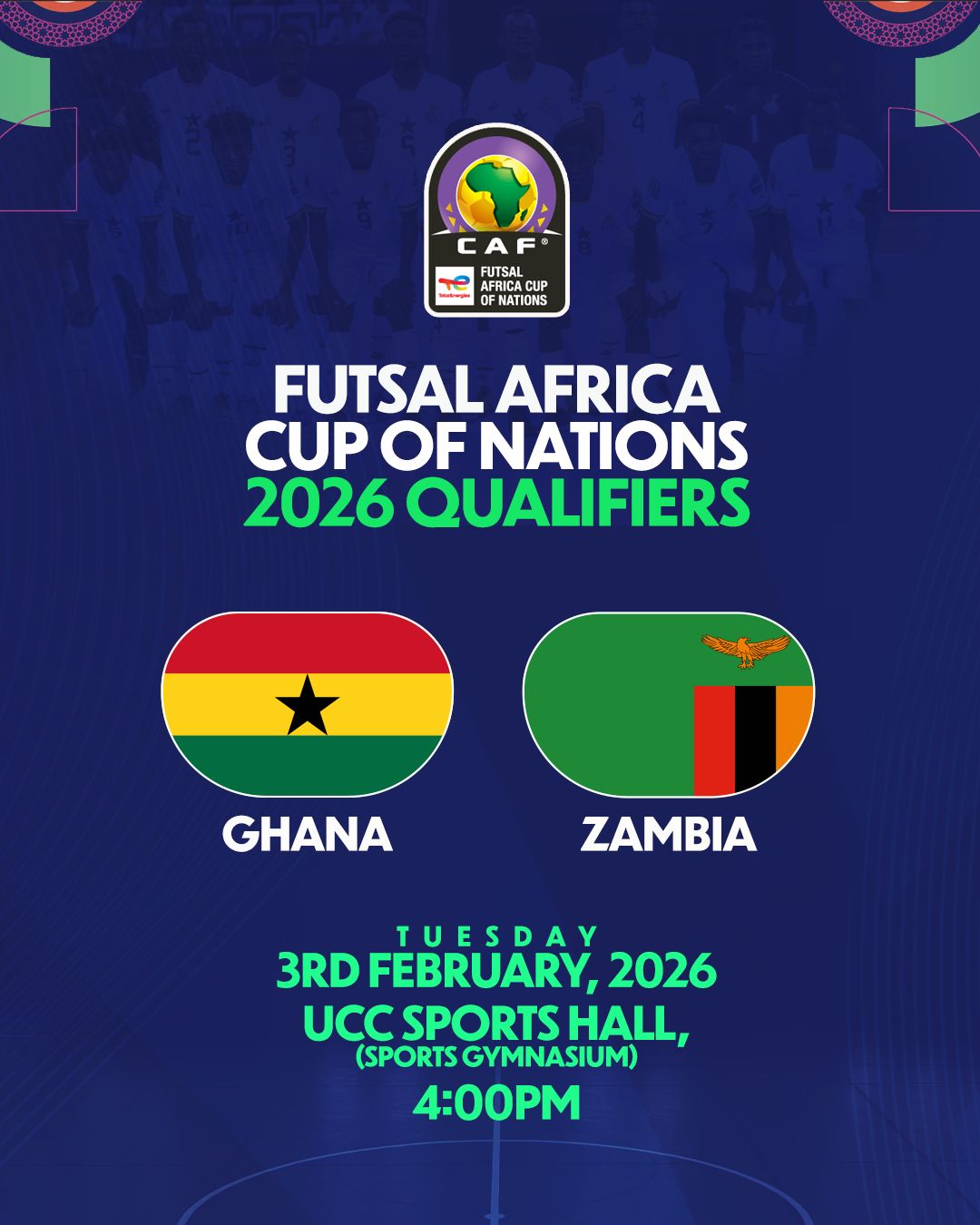 The Confederation of African Football has announced the match officials for the upcoming Futsal qualifier between Ghana and Zambia. The match will be played at the UCC Sports Hall in Cape Coast on February 3, 2026, at 15:00 local time.